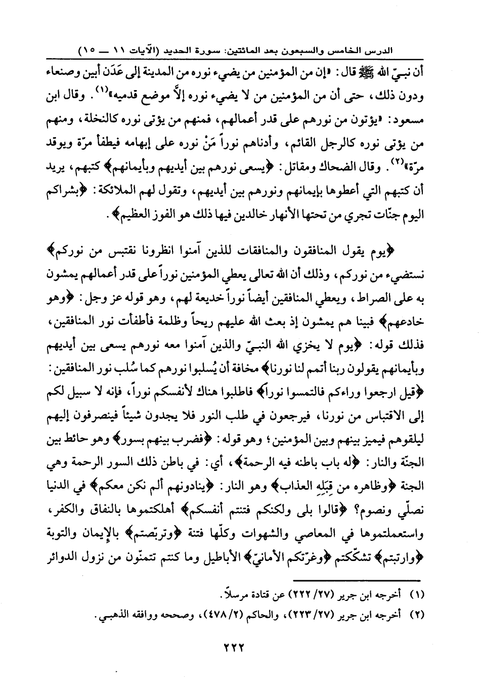 أن نبيّ الله - صلى الله عليه وسلم - قال: «إن من المؤمنين من يضيء نوره من المدينة إلى عَدَن أبين وصنعاء ودون ذلك، حتى أن من المؤمنين من لا يضيء نوره إلا موضع قدميه» . وقال ابن مسعود: (يؤتون من نورهم على قدر أعمالهم، فمنهم من يؤتى نوره كالنخلة، ومنهم من يؤتى نوره كالرجل القائم، وأدناهم نورًا مَنْ نوره على إبهامه فيطفأ مرّة ويوقد مرّة) . وقال الضحاك، ومقاتل: {يَسْعَى نُورُهُم بَيْنَ أَيْدِيهِمْ وَبِأَيْمَانِهِم} كتبهم، يريد أن كتبهم التي أعطوها بإيمانهم ونورهم بين أيديهم، وتقول لهم الملائكة: {بُشْرَاكُمُ الْيَوْمَ جَنَّاتٌ تَجْرِي مِن تَحْتِهَا الْأَنْهَارُ خَالِدِينَ فِيهَا ذَلِكَ هُوَ الْفَوْزُ الْعَظِيمُ} .