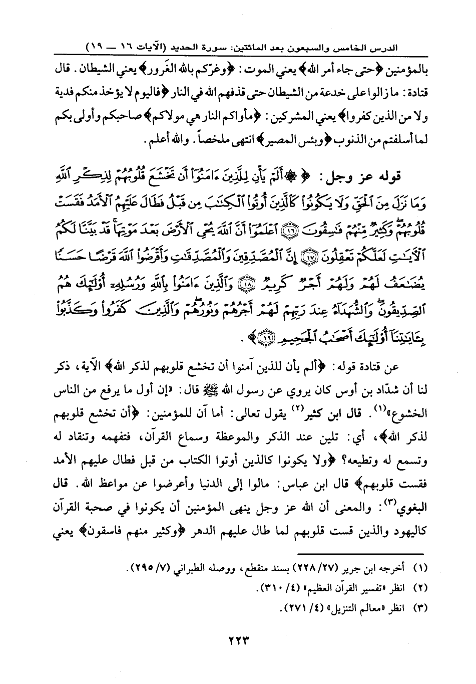 قوله عز وجل: {أَلَمْ يَأْنِ لِلَّذِينَ آمَنُوا أَن تَخْشَعَ قُلُوبُهُمْ لِذِكْرِ اللَّهِ وَمَا نَزَلَ مِنَ الْحَقِّ وَلَا يَكُونُوا كَالَّذِينَ أُوتُوا الْكِتَابَ مِن قَبْلُ فَطَالَ عَلَيْهِمُ الْأَمَدُ فَقَسَتْ قُلُوبُهُمْ وَكَثِيرٌ مِّنْهُمْ فَاسِقُونَ (16) اعْلَمُوا أَنَّ اللَّهَ يُحْيِي الْأَرْضَ بَعْدَ مَوْتِهَا قَدْ بَيَّنَّا لَكُمُ الْآيَاتِ لَعَلَّكُمْ تَعْقِلُونَ (17) إِنَّ الْمُصَّدِّقِينَ وَالْمُصَّدِّقَاتِ وَأَقْرَضُوا اللَّهَ قَرْضاً حَسَناً يُضَاعَفُ لَهُمْ وَلَهُمْ أَجْرٌ كَرِيمٌ (18) وَالَّذِينَ آمَنُوا بِاللَّهِ وَرُسُلِهِ أُوْلَئِكَ هُمُ الصِّدِّيقُونَ