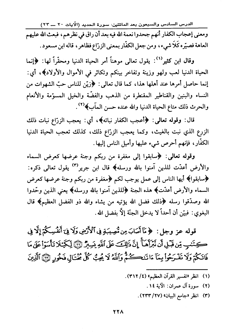 قوله عز وجل: {مَا أَصَابَ مِن مُّصِيبَةٍ فِي الْأَرْضِ وَلَا فِي أَنفُسِكُمْ إِلَّا فِي كِتَابٍ مِّن قَبْلِ أَن نَّبْرَأَهَا إِنَّ ذَلِكَ عَلَى اللَّهِ يَسِيرٌ (22) لِكَيْلَا تَأْسَوْا عَلَى مَا فَاتَكُمْ وَلَا تَفْرَحُوا بِمَا آتَاكُمْ وَاللَّهُ لَا يُحِبُّ كُلَّ مُخْتَالٍ فَخُورٍ (23) الَّذِينَ