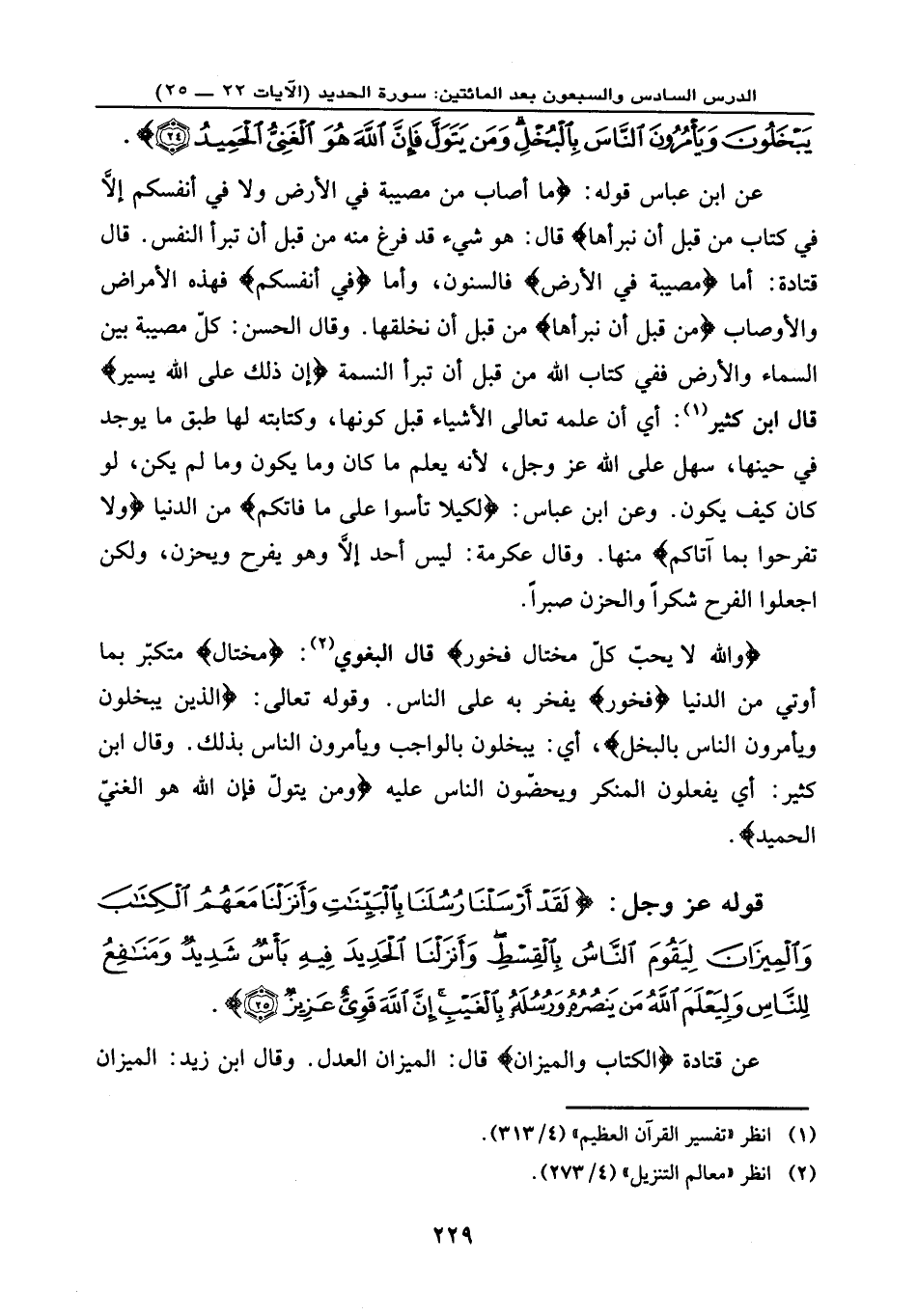 عن ابن عباس: قوله: {مَا أَصَابَ مِن مُّصِيبَةٍ فِي الْأَرْضِ وَلَا فِي أَنفُسِكُمْ إِلَّا فِي كِتَابٍ مِّن قَبْلِ أَن نَّبْرَأَهَا} ، قال: هو شيء قد فرغ منه قبل أن تبرأ النفس. قال قتادة: أما: {مُّصِيبَةٍ فِي الْأَرْضِ} فالسنون، وأما: {فِي أَنفُسِكُمْ} فهذه الأمراض والأوصاب {مِّن قَبْلِ أَن نَّبْرَأَهَا} من قبل أن نخلقها. وقال الحسن: كلّ مصيبة بين السماء والأرض ففي كتاب الله من قبل أن تبرأ النسمة، {إِنَّ ذَلِكَ عَلَى اللَّهِ يَسِيرٌ} ، قال ابن كثير: أي: أن علمه تعالى الأشياء قبل كونها، وكتابته لها طبق ما يوجد في حينها سهل على الله عز وجل، لأنه يعلم ما كان وما يكون وما لم يكن، لو كان كيف يكون. وعن ابن عباس: {لِكَيْلَا تَأْسَوْا عَلَى مَا فَاتَكُمْ} من الدنيا، {وَلَا تَفْرَحُوا بِمَا آتَاكُمْ} منها. وقال عكرمة: ليس أحد إلا وهو يفرح ويحزن، ولكن اجعلوا الفرح شكرًا، والحزن صبرًا.