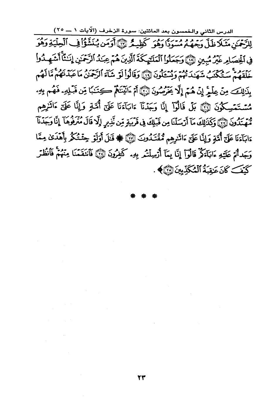 شَهَادَتُهُمْ وَيُسْأَلُونَ (19) وَقَالُوا لَوْ شَاء الرَّحْمَنُ مَا عَبَدْنَاهُم مَّا لَهُم بِذَلِكَ مِنْ عِلْمٍ إِنْ هُمْ إِلَّا يَخْرُصُونَ (20) أَمْ آتَيْنَاهُمْ كِتَاباً مِّن قَبْلِهِ فَهُم بِهِ مُسْتَمْسِكُونَ (21) بَلْ قَالُوا إِنَّا وَجَدْنَا آبَاءنَا عَلَى أُمَّةٍ وَإِنَّا عَلَى آثَارِهِم مُّهْتَدُونَ (22) وَكَذَلِكَ مَا أَرْسَلْنَا مِن قَبْلِكَ فِي قَرْيَةٍ مِّن نَّذِيرٍ إِلَّا قَالَ مُتْرَفُوهَا إِنَّا وَجَدْنَا آبَاءنَا عَلَى أُمَّةٍ وَإِنَّا عَلَى آثَارِهِم مُّقْتَدُونَ (23) قَالَ أَوَلَوْ جِئْتُكُم بِأَهْدَى مِمَّا وَجَدتُّمْ عَلَيْهِ آبَاءكُمْ قَالُوا إِنَّا بِمَا أُرْسِلْتُم بِهِ كَافِرُونَ (24) فَانتَقَمْنَا مِنْهُمْ فَانظُرْ كَيْفَ كَانَ عَاقِبَةُ الْمُكَذِّبِينَ (25) } .