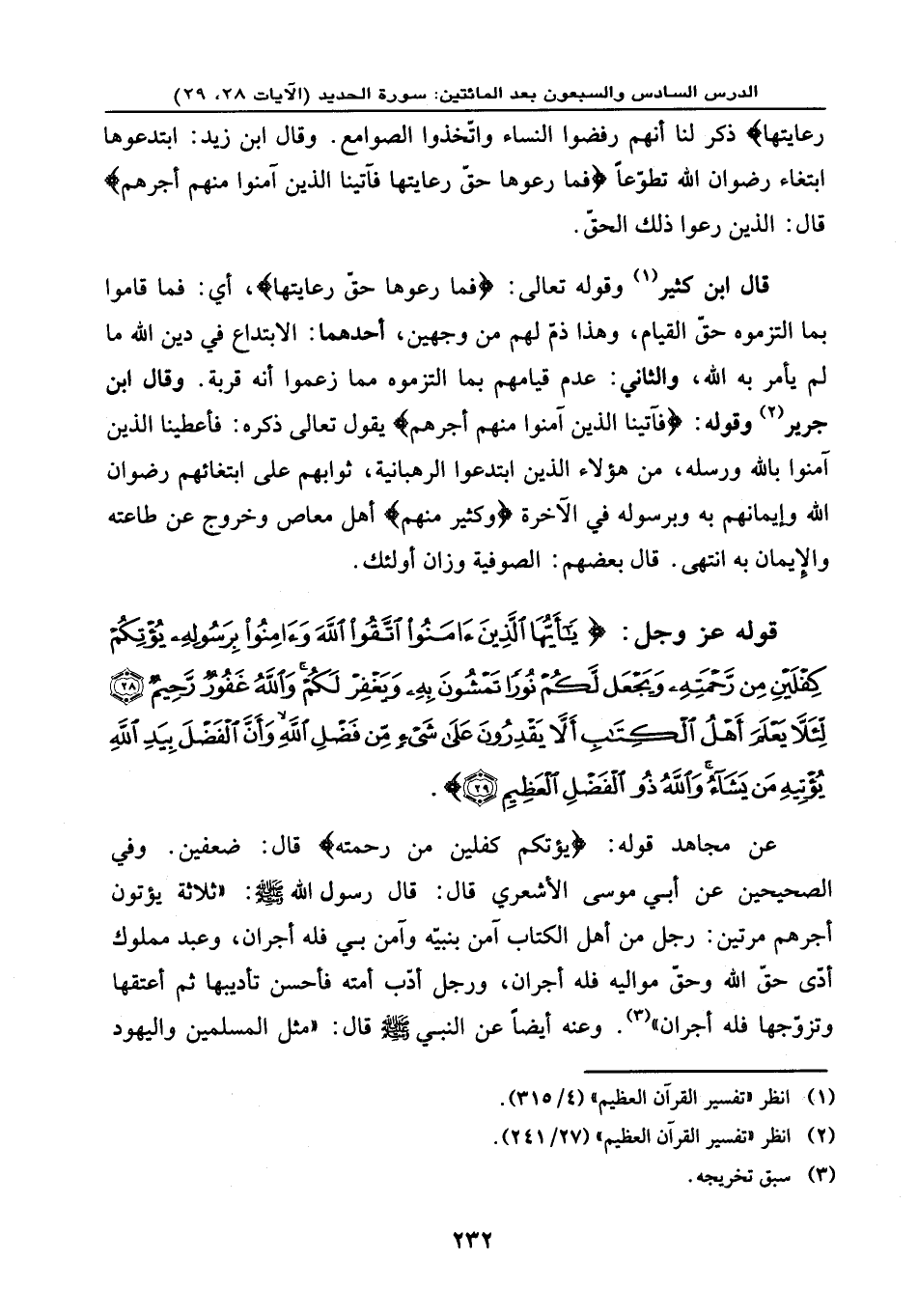 قوله عز وجل: {يَا أَيُّهَا الَّذِينَ آمَنُوا اتَّقُوا اللَّهَ وَآمِنُوا بِرَسُولِهِ يُؤْتِكُمْ كِفْلَيْنِ مِن رَّحْمَتِهِ وَيَجْعَل لَّكُمْ نُوراً تَمْشُونَ بِهِ وَيَغْفِرْ لَكُمْ وَاللَّهُ غَفُورٌ رَّحِيمٌ (28) لِئَلَّا يَعْلَمَ أَهْلُ الْكِتَابِ أَلَّا يَقْدِرُونَ عَلَى شَيْءٍ مِّن فَضْلِ اللَّهِ وَأَنَّ الْفَضْلَ بِيَدِ اللَّهِ يُؤْتِيهِ مَن يَشَاءُ وَاللَّهُ ذُو الْفَضْلِ الْعَظِيمِ (29) } .