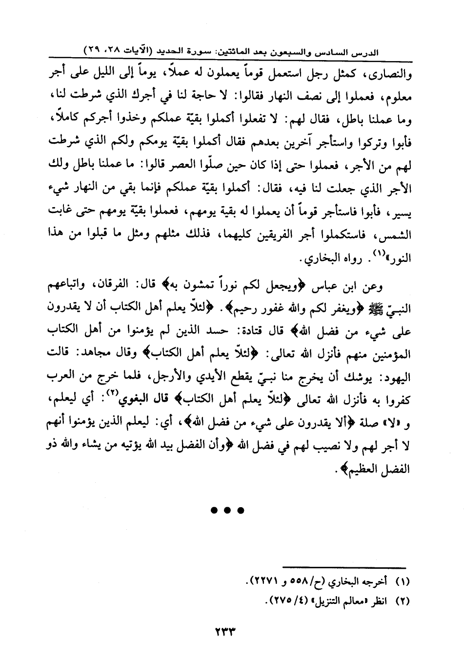 وعن ابن عباس: {وَيَجْعَل لَّكُمْ نُوراً تَمْشُونَ بِهِ} ، قال: الفرقان واتباعهم النبيّ - صلى الله عليه وسلم -، {وَيَغْفِرْ لَكُمْ وَاللَّهُ غَفُورٌ رَّحِيمٌ} . {لِئَلَّا يَعْلَمَ أَهْلُ الْكِتَابِ أَلَّا يَقْدِرُونَ عَلَى شَيْءٍ مِّن فَضْلِ اللَّهِ} ، قال قتادة: حسد الذين لم يؤمنوا من أهل الكتاب المؤمنين منهم فأنزل الله تعالى: {لِئَلَّا يَعْلَمَ أَهْلُ الْكِتَابِ} ، وقال مجاهد: قالت اليهود: يوشك أن يخرج منا نبيّ يقطع الأيدي والأرجل، فلما خرج من العرب كفروا به فأنزل الله تعالى: {لِئَلَّا يَعْلَمَ أَهْلُ الْكِتَابِ} ، قال البغوي: أي: ليعلم و (لا) صلة {أَلَّا يَقْدِرُونَ عَلَى شَيْءٍ مِّن فَضْلِ اللَّهِ} أي: ليعلم الذين يؤمنوا