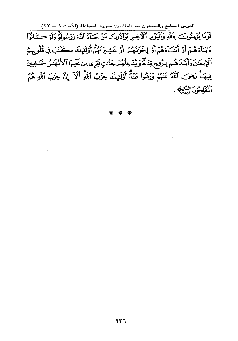 قَوْماً يُؤْمِنُونَ بِاللَّهِ وَالْيَوْمِ الْآخِرِ يُوَادُّونَ مَنْ حَادَّ اللَّهَ وَرَسُولَهُ وَلَوْ كَانُوا آبَاءهُمْ أَوْ أَبْنَاءهُمْ أَوْ إِخْوَانَهُمْ أَوْ عَشِيرَتَهُمْ أُوْلَئِكَ كَتَبَ فِي قُلُوبِهِمُ الْإِيمَانَ وَأَيَّدَهُم بِرُوحٍ مِّنْهُ وَيُدْخِلُهُمْ جَنَّاتٍ تَجْرِي مِن تَحْتِهَا الْأَنْهَارُ خَالِدِينَ فِيهَا رَضِيَ اللَّهُ عَنْهُمْ وَرَضُوا عَنْهُ أُوْلَئِكَ حِزْبُ اللَّهِ أَلَا إِنَّ حِزْبَ اللَّهِ هُمُ الْمُفْلِحُونَ (22) } .