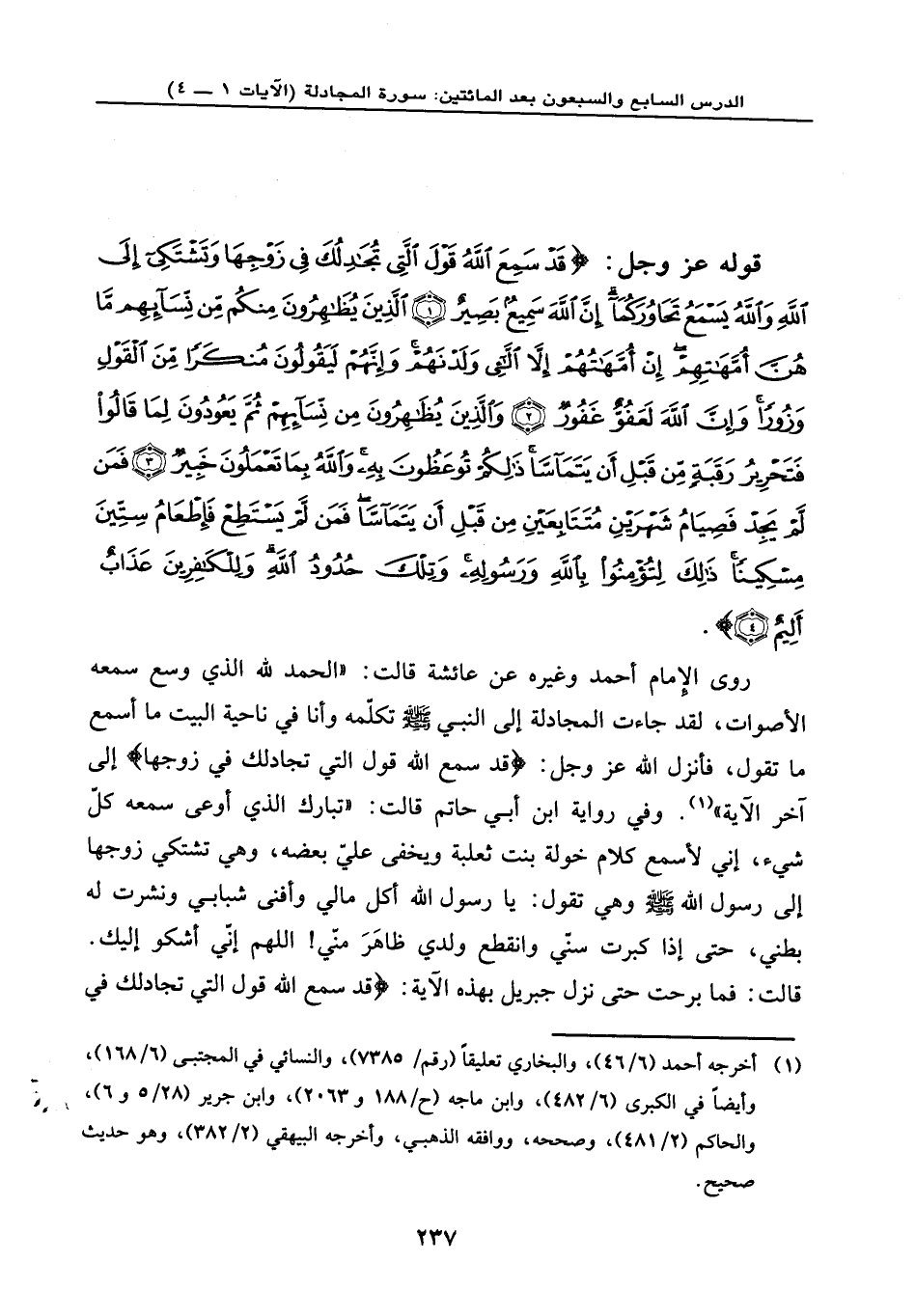 قوله عز وجل: {قَدْ سَمِعَ اللَّهُ قَوْلَ الَّتِي تُجَادِلُكَ فِي زَوْجِهَا وَتَشْتَكِي إِلَى اللَّهِ وَاللَّهُ يَسْمَعُ تَحَاوُرَكُمَا إِنَّ اللَّهَ سَمِيعٌ بَصِيرٌ (1) الَّذِينَ يُظَاهِرُونَ مِنكُم مِّن نِّسَائِهِم مَّا هُنَّ أُمَّهَاتِهِمْ إِنْ أُمَّهَاتُهُمْ إِلَّا اللَّائِي وَلَدْنَهُمْ وَإِنَّهُمْ لَيَقُولُونَ مُنكَراً مِّنَ الْقَوْلِ وَزُوراً وَإِنَّ اللَّهَ لَعَفُوٌّ غَفُورٌ (2) وَالَّذِينَ يُظَاهِرُونَ مِن نِّسَائِهِمْ ثُمَّ يَعُودُونَ لِمَا قَالُوا فَتَحْرِيرُ رَقَبَةٍ مِّن قَبْلِ أَن يَتَمَاسَّا ذَلِكُمْ تُوعَظُونَ بِهِ وَاللَّهُ بِمَا تَعْمَلُونَ خَبِيرٌ (3) فَمَن لَّمْ يَجِدْ فَصِيَامُ شَهْرَيْنِ مُتَتَابِعَيْنِ مِن قَبْلِ أَن يَتَمَاسَّا فَمَن لَّمْ يَسْتَطِعْ فَإِطْعَامُ سِتِّينَ مِسْكِيناً ذَلِكَ لِتُؤْمِنُوا بِاللَّهِ وَرَسُولِهِ وَتِلْكَ حُدُودُ اللَّهِ وَلِلْكَافِرِينَ عَذَابٌ أَلِيمٌ (4) } .