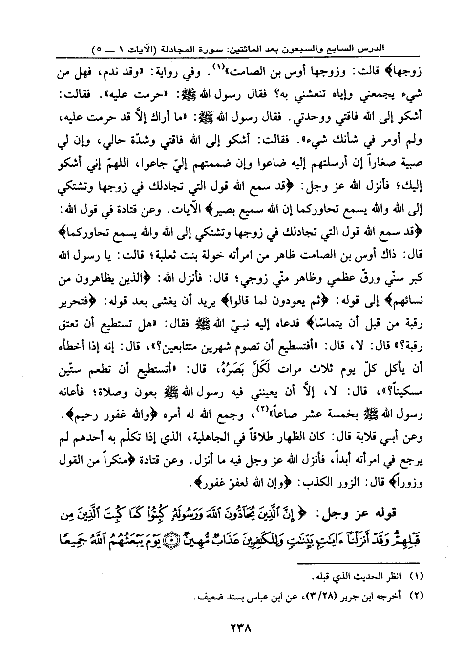 «حرمت عليه» . فقالت: أشكو إلى الله فاقتي ووحدتي. فقال رسول الله - صلى الله عليه وسلم -: «ما أراك إلا قد حرمت عليه، ولم أومر في شأنك شيء» . فقالت: أشكو إلى الله فاقتي وشدّة حالي، وإن لي صبية صغارًا إن أرسلتهم إليه ضاعوا وإن ضممتهم إليّ جاعوا، اللهمّ إني أشكو إليك؛ فأنزل الله عز وجل: {قَدْ سَمِعَ اللَّهُ قَوْلَ الَّتِي تُجَادِلُكَ فِي زَوْجِهَا وَتَشْتَكِي إِلَى اللَّهِ وَاللَّهُ يَسْمَعُ تَحَاوُرَكُمَا إِنَّ اللَّهَ سَمِيعٌ بَصِيرٌ} الآيات) . وعن قتادة في قول الله: {قَدْ سَمِعَ اللَّهُ قَوْلَ الَّتِي تُجَادِلُكَ فِي زَوْجِهَا وَتَشْتَكِي إِلَى اللَّهِ وَاللَّهُ يَسْمَعُ تَحَاوُرَكُمَا} ، قال: ذاك أوس بن الصامت ظاهر من امرأته خولة بنت ثعلبة؛ قالت: يا رسول الله كبر سنّي ورقّ عظمي وظاهر منّي زوجي؛ قال: فأنزل الله: {الَّذِينَ يُظَاهِرُونَ مِنكُم مِّن نِّسَائِهِم} إلى قوله: {ثُمَّ يَعُودُونَ لِمَا قَالُوا} يريد أن يغشى بعد قوله: {فَتَحْرِيرُ رَقَبَةٍ مِّن قَبْلِ أَن يَتَمَاسَّا} فدعاه إليه نبيّ الله - صلى الله عليه وسلم - فقال: «هل تستطيع أن تعتق رقبة» ؟ قال: لا. قال: ... «أفتسطيع أن تصوم شهرين متتابعين» ؟ قال: إنه إذا أخطأه أن يأكل كل يوم ثلاث مرات لَكَلّ بَصَرُهُ، قال: «أتستطيع أن تطعم ستين مسكينًا» ؟ قال: لا، إلا أن يعينني فيه رسول الله - صلى الله عليه وسلم - بعون وصلاة؛ فأعانه رسول الله - صلى الله عليه وسلم - بخمسة عشر صاعًا. وجمع الله له أمره، {وَاللهُ غَفُورٌ رَّحِيمٌ} وعن أبي قلابة قال: كان الظهار طلاقًا في الجاهلية، الذي إذا تكلّم به أحدهم لم يرجع في امرأته أبدًا، فأنزل الله عز وجل فيه
