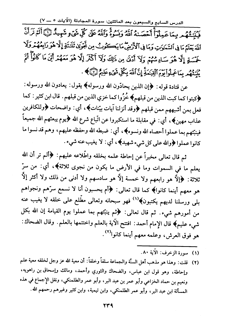 فَيُنَبِّئُهُم بِمَا عَمِلُوا أَحْصَاهُ اللَّهُ وَنَسُوهُ وَاللَّهُ عَلَى كُلِّ شَيْءٍ شَهِيدٌ (6) أَلَمْ تَرَ أَنَّ اللَّهَ يَعْلَمُ مَا فِي السَّمَاوَاتِ وَمَا فِي الْأَرْضِ مَا يَكُونُ مِن نَّجْوَى ثَلَاثَةٍ إِلَّا هُوَ رَابِعُهُمْ وَلَا خَمْسَةٍ إِلَّا هُوَ سَادِسُهُمْ وَلَا أَدْنَى مِن ذَلِكَ وَلَا أَكْثَرَ إِلَّا هُوَ مَعَهُمْ أَيْنَ مَا كَانُوا ثُمَّ يُنَبِّئُهُم بِمَا عَمِلُوا يَوْمَ الْقِيَامَةِ إِنَّ اللَّهَ بِكُلِّ شَيْءٍ عَلِيمٌ (7) } .