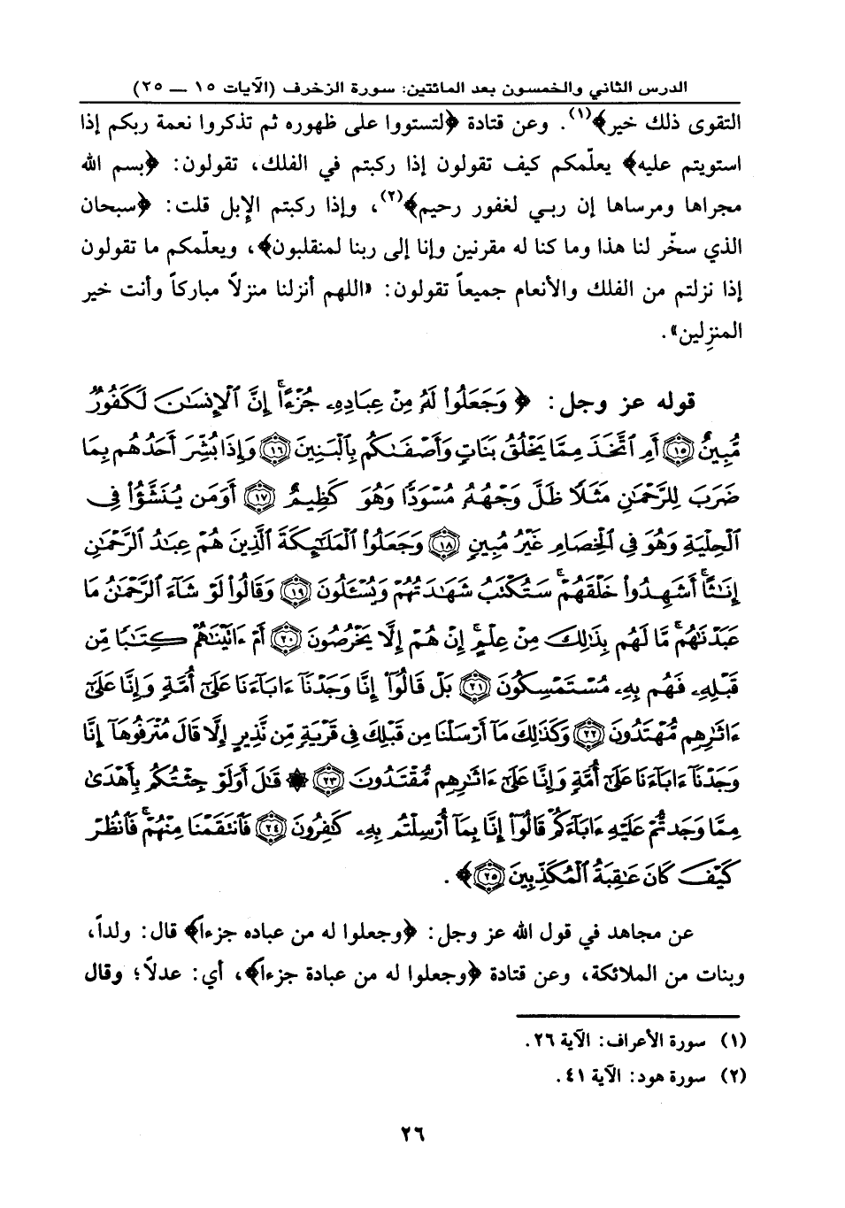 قوله عز وجل: {وَجَعَلُوا لَهُ مِنْ عِبَادِهِ جُزْءاً إِنَّ الْإِنسَانَ لَكَفُورٌ مُّبِينٌ (15) أَمِ اتَّخَذَ مِمَّا يَخْلُقُ بَنَاتٍ وَأَصْفَاكُم بِالْبَنِينَ (16) وَإِذَا بُشِّرَ أَحَدُهُم بِمَا ضَرَبَ لِلرَّحْمَنِ مَثَلاً ظَلَّ وَجْهُهُ مُسْوَدّاً وَهُوَ كَظِيمٌ (17) أَوَمَن يُنَشَّأُ فِي الْحِلْيَةِ وَهُوَ فِي الْخِصَامِ غَيْرُ مُبِينٍ (18) وَجَعَلُوا الْمَلَائِكَةَ الَّذِينَ هُمْ عِبَادُ الرَّحْمَنِ إِنَاثاً أَشَهِدُوا خَلْقَهُمْ سَتُكْتَبُ شَهَادَتُهُمْ وَيُسْأَلُونَ (19) وَقَالُوا لَوْ شَاء الرَّحْمَنُ مَا عَبَدْنَاهُم مَّا لَهُم بِذَلِكَ مِنْ عِلْمٍ إِنْ هُمْ إِلَّا يَخْرُصُونَ (20) أَمْ آتَيْنَاهُمْ كِتَاباً مِّن قَبْلِهِ فَهُم بِهِ مُسْتَمْسِكُونَ (21) بَلْ قَالُوا إِنَّا وَجَدْنَا آبَاءنَا عَلَى أُمَّةٍ وَإِنَّا عَلَى آثَارِهِم مُّهْتَدُونَ (22) وَكَذَلِكَ مَا أَرْسَلْنَا مِن قَبْلِكَ فِي قَرْيَةٍ مِّن نَّذِيرٍ