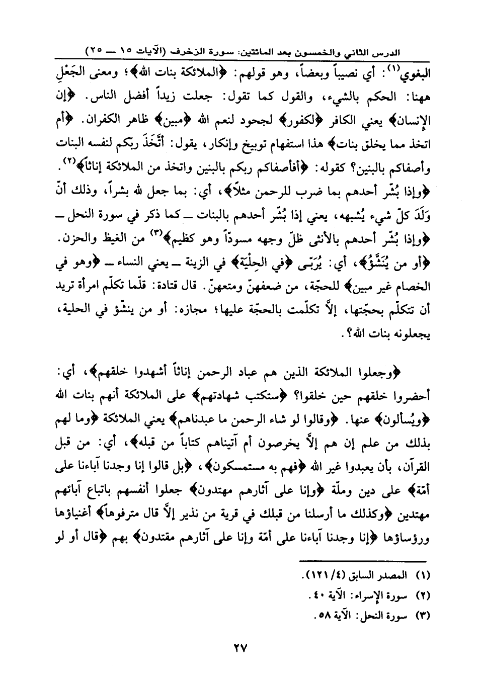{وَجَعَلُوا الْمَلَائِكَةَ الَّذِينَ هُمْ عِبَادُ الرَّحْمَنِ إِنَاثاً أَشَهِدُوا خَلْقَهُمْ} ، أي: أحضروا خلقهم حين خلقوا {سَتُكْتَبُ شَهَادَتُهُمْ} على الملائكة أنهم بنات الله، {وَيُسْأَلُونَ} عنها. {وَقَالُوا لَوْ شَاء الرَّحْمَنُ مَا عَبَدْنَاهُم} ، يعنى: الملائكة، {مَّا لَهُم بِذَلِكَ مِنْ عِلْمٍ إِنْ هُمْ إِلَّا يَخْرُصُونَ * أَمْ آتَيْنَاهُمْ كِتَاباً مِّن قَبْلِهِ} ، أي: من قبل القرآن بأن يعبدوا غير الله، {فَهُم بِهِ مُسْتَمْسِكُونَ} ، {بَلْ قَالُوا إِنَّا وَجَدْنَا آبَاءنَا عَلَى أُمَّةٍ} على دين وملة، {وَإِنَّا عَلَى آثَارِهِم مُّهْتَدُونَ} جعلوا أنفسهم بإتباع آبائهم مهتدون {وَكَذَلِكَ مَا أَرْسَلْنَا مِن قَبْلِكَ فِي قَرْيَةٍ مِّن نَّذِيرٍ إِلَّا قَالَ مُتْرَفُوهَا} أغنياؤها ورؤساؤها، {إِنَّا وَجَدْنَا آبَاءنَا عَلَى أُمَّةٍ وَإِنَّا عَلَى آثَارِهِم مُّقْتَدُونَ} بهم {قَالَ أَوَلَوْ