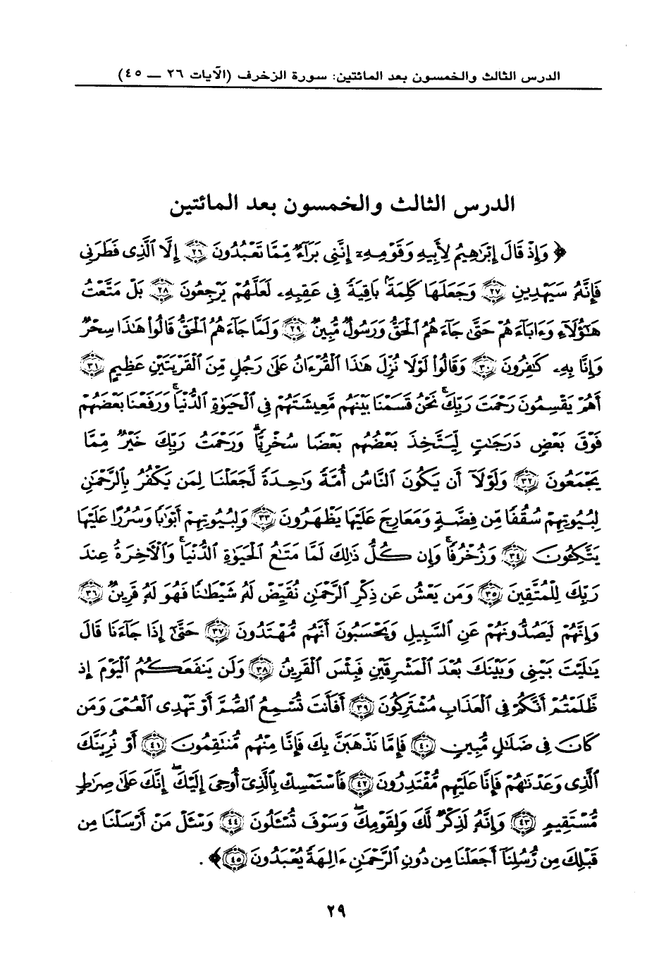 {وَإِذْ قَالَ إِبْرَاهِيمُ لِأَبِيهِ وَقَوْمِهِ إِنَّنِي بَرَاء مِّمَّا تَعْبُدُونَ (26) إِلَّا الَّذِي فَطَرَنِي فَإِنَّهُ سَيَهْدِينِ (27) وَجَعَلَهَا كَلِمَةً بَاقِيَةً فِي عَقِبِهِ لَعَلَّهُمْ يَرْجِعُونَ (28) بَلْ مَتَّعْتُ هَؤُلَاء وَآبَاءهُمْ حَتَّى جَاءهُمُ الْحَقُّ وَرَسُولٌ مُّبِينٌ (29) وَلَمَّا جَاءهُمُ الْحَقُّ قَالُوا هَذَا سِحْرٌ وَإِنَّا بِهِ كَافِرُونَ (30) وَقَالُوا لَوْلَا نُزِّلَ هَذَا الْقُرْآنُ عَلَى رَجُلٍ مِّنَ الْقَرْيَتَيْنِ عَظِيمٍ (31) أَهُمْ يَقْسِمُونَ رَحْمَةَ رَبِّكَ نَحْنُ قَسَمْنَا بَيْنَهُم مَّعِيشَتَهُمْ فِي الْحَيَاةِ الدُّنْيَا وَرَفَعْنَا بَعْضَهُمْ فَوْقَ بَعْضٍ دَرَجَاتٍ لِيَتَّخِذَ بَعْضُهُم بَعْضاً سُخْرِيّاً وَرَحْمَتُ رَبِّكَ خَيْرٌ مِّمَّا يَجْمَعُونَ (32) وَلَوْلَا أَن يَكُونَ النَّاسُ أُمَّةً وَاحِدَةً لَجَعَلْنَا لِمَن يَكْفُرُ بِالرَّحْمَنِ لِبُيُوتِهِمْ سُقُفاً مِّن فَضَّةٍ وَمَعَارِجَ عَلَيْهَا يَظْهَرُونَ (33) وَلِبُيُوتِهِمْ أَبْوَاباً وَسُرُراً عَلَيْهَا يَتَّكِؤُونَ (34) وَزُخْرُفاً وَإِن كُلُّ ذَلِكَ لَمَّا مَتَاعُ الْحَيَاةِ الدُّنْيَا وَالْآخِرَةُ عِندَ رَبِّكَ لِلْمُتَّقِينَ (35) وَمَن يَعْشُ عَن ذِكْرِ الرَّحْمَنِ نُقَيِّضْ لَهُ شَيْطَاناً فَهُوَ لَهُ قَرِينٌ (36) وَإِنَّهُمْ لَيَصُدُّونَهُمْ عَنِ السَّبِيلِ وَيَحْسَبُونَ أَنَّهُم مُّهْتَدُونَ (37) حَتَّى إِذَا جَاءنَا قَالَ يَا لَيْتَ بَيْنِي وَبَيْنَكَ بُعْدَ الْمَشْرِقَيْنِ فَبِئْسَ الْقَرِينُ (38) وَلَن يَنفَعَكُمُ الْيَوْمَ إِذ ظَّلَمْتُمْ أَنَّكُمْ فِي الْعَذَابِ مُشْتَرِكُونَ (39) أَفَأَنتَ تُسْمِعُ الصُّمَّ أَوْ تَهْدِي الْعُمْيَ وَمَن كَانَ فِي ضَلَالٍ مُّبِينٍ (40) فَإِمَّا نَذْهَبَنَّ بِكَ فَإِنَّا مِنْهُم مُّنتَقِمُونَ (41) أَوْ نُرِيَنَّكَ الَّذِي وَعَدْنَاهُمْ فَإِنَّا عَلَيْهِم مُّقْتَدِرُونَ (42) فَاسْتَمْسِكْ بِالَّذِي أُوحِيَ إِلَيْكَ