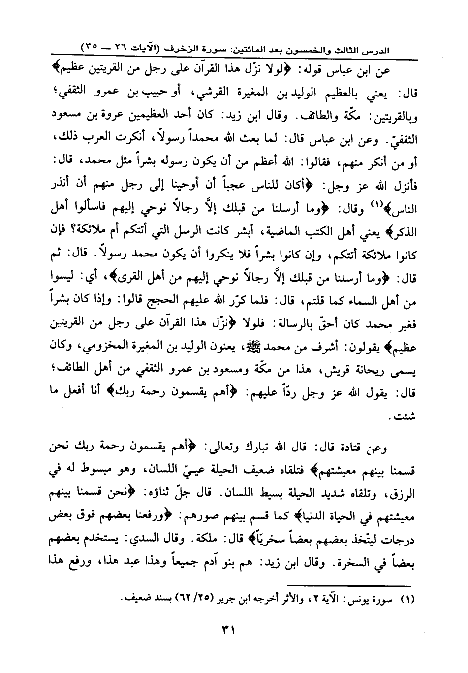 وعن ابن عباس قوله: {لَوْلَا نُزِّلَ هَذَا الْقُرْآنُ عَلَى رَجُلٍ مِّنَ الْقَرْيَتَيْنِ عَظِيمٍ} ، قال: يعني بالعظيم: الوليد بن المغيرة القرشي، أو حبيب بن عمرو الثقفي؛ وبالقريتين: مكة، والطائف. وقال ابن زيد: كان أحد العظيمين عروة بن مسعود الثقفي. وعن ابن عباس قال: لما بعث الله محمدًا رسولاً، أنكرت العرب ذلك، أو من أنكر منهم، فقالوا: الله أعظم من أن يكون رسوله بشرًا مثل محمد، قال: فأنزل الله عز وجل: {أَكَانَ لِلنَّاسِ عَجَباً أَنْ أَوْحَيْنَا إِلَى رَجُلٍ مِّنْهُمْ أَنْ أَنذِرِ النَّاسَ} ، وقال: {وَمَا أَرْسَلْنَا مِن قَبْلِكَ إِلاَّ رِجَالاً نُّوحِي إِلَيْهِمْ فَاسْأَلُواْ أَهْلَ الذِّكْرِ} يعني: أهل الكتب الماضية، أبشر كانت الرسل التي أتتكم أم ملائكة؟ فإن كانوا ملائكة أتتكم، وإن كانوا بشرًا فلا ينكروا أن يكون محمد رسولاً. قال: ثم قال: {وَمَا أَرْسَلْنَا مِن قَبْلِكَ إِلاَّ رِجَالاً نُّوحِي إِلَيْهِم مِّنْ أَهْلِ الْقُرَى} أي: ليسوا من أهل السماء كما قلتم. قال: فلما كرر الله عليهم الحجج قالوا: وإذا كان بشرًا فغير محمد كان أحق بالرسالة: فلولا {نُزِّلَ هَذَا الْقُرْآنُ عَلَى رَجُلٍ مِّنَ الْقَرْيَتَيْنِ عَظِيمٍ} ، يقولون: أشرف من محمد - صلى الله عليه وسلم -، يعنون الوليد بن المغيرة المخزومي، وكان يسمى ريحانة قريش، هذا من مكة ومسعود بن عمرو الثقفي من