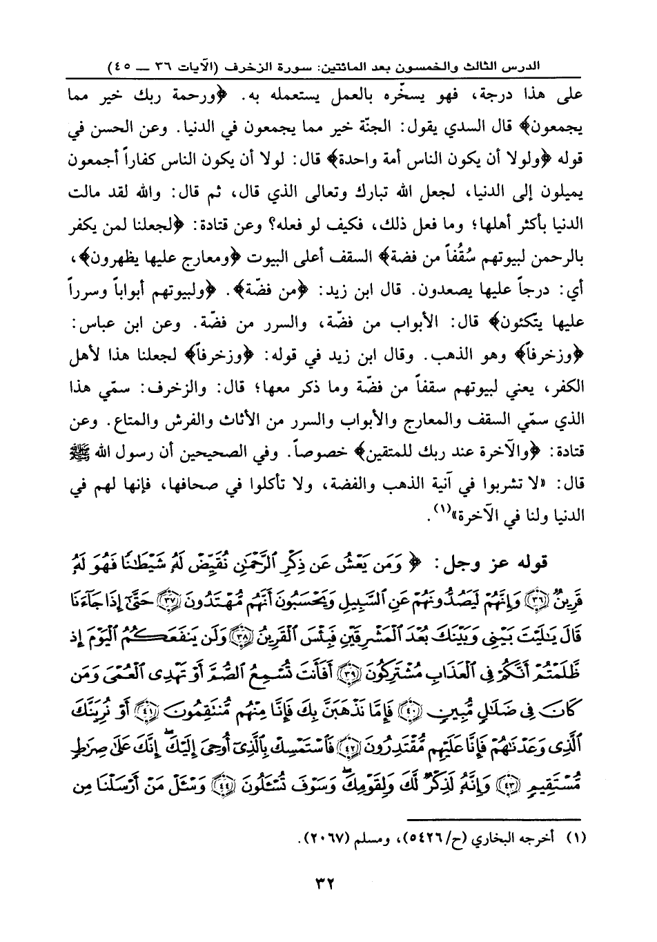 على هذا درجة، فهو يسخره بالعمل يستعمله به. {وَرَحْمَتُ رَبِّكَ خَيْرٌ مِّمَّا يَجْمَعُونَ} ، قال السدي يقول: الجنة خير مما يجمعون في الدنيا. وعن الحسن في قوله: {وَلَوْلَا أَن يَكُونَ النَّاسُ أُمَّةً وَاحِدَةً} ، قال: لولا أن يكون الناس كفارًا أجمعون يميلون إلى الدنيا، لجعل الله تبارك وتعالى الذي قال. ثم قال: والله لقد مالت الدنيا بأكثر أهلها؛ وما فعل ذلك، فكيف لو فعله؟ وعن قتادة: {لَجَعَلْنَا لِمَن يَكْفُرُ بِالرَّحْمَنِ لِبُيُوتِهِمْ سُقُفاً مِّن فَضَّةٍ} السقف أعلى البيوت، {وَمَعَارِجَ عَلَيْهَا يَظْهَرُونَ} ، أي: درجًا عليها يصعدون. قال ابن زيد: {مِّن فَضَّةٍ} . {وَلِبُيُوتِهِمْ أَبْوَاباً وَسُرُراً عَلَيْهَا يَتَّكِؤُونَ} ، قال: الأبواب من فضة، والسرر من فضة. وعن ابن عباس: {وَزُخْرُفاً} وهو الذهب. وقال ابن زيد في قوله: {وَزُخْرُفاً} لجعلنا هذا لأهل الكفر،