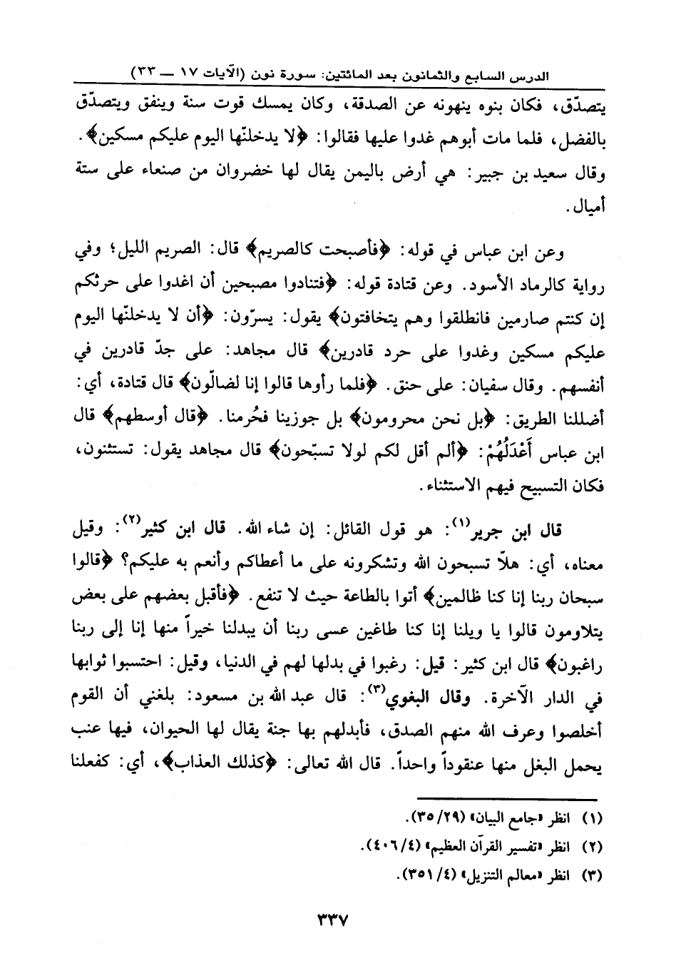 وعن ابن عباس في قوله: {فَأَصْبَحَتْ كَالصَّرِيمِ} ، قال: الصريم: الليل؛ وفي رواية كالرماد الأسود. وعن قتادة: قوله: {فَتَنَادَوا مُصْبِحِينَ * أَنِ اغْدُوا عَلَى حَرْثِكُمْ إِن كُنتُمْ صَارِمِينَ * فَانطَلَقُوا وَهُمْ يَتَخَافَتُونَ} ، يقول: يسرّون، {أَن لَّا يَدْخُلَنَّهَا الْيَوْمَ عَلَيْكُم مِّسْكِينٌ * وَغَدَوْا عَلَى حَرْدٍ قَادِرِينَ} ، قال مجاهد: على جدّ قادرين في أنفسهم. وقال سفيان: على حنق. {فَلَمَّا رَأَوْهَا قَالُوا إِنَّا لَضَالُّونَ} ، قال قتادة: أي: أضللنا الطريق، {بَلْ نَحْنُ مَحْرُومُونَ} ، بل جوزينا فحُرمنا. {قَالَ أَوْسَطُهُمْ} ، قال ابن عباس: أَعْدَلُهُمْ، {أَلَمْ أَقُل لَّكُمْ لَوْلَا تُسَبِّحُونَ} ، قال مجاهد: يقول: تستثنون، فكان التسبيح فيهم الاستنثاء.