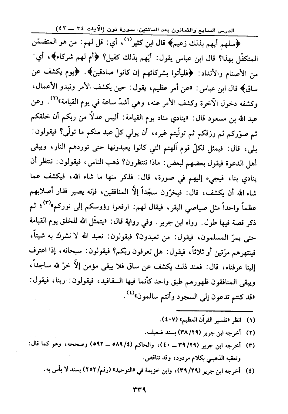 منها ما شاء الله، فيكشف عما شاء الله أن يكشف، قال: فيخرّون سجّدًا إلا المنافقين، فإنه يصير فقار أصلابهم عظمًا واحدًا مثل صياصي البقر، فيقال لهم: ارفعوا رؤوسكم إلى نوركم) ؛ ثم ذكر قصة فيها طول. رواه ابن جرير. وفي رواية قال: (يتمثّل الله للخلق يوم القيامة حتى يمرّ المسلمون، فيقول: من تعبدون؟ فيقولون: نعبد الله لا نشرك به شيئًا فينتهرهم مرّتين أو ثلاثًا، فيقول: هل تعرفون ربّكم؟ فيقولون: سبحانه، إذا اعترف إلينا عرفناه، قال: فعند ذلك يكشف عن ساق فلا يبقى مؤمن إلا خرّ لله ساجدًا، ويبقى المنافقون ظهورهم طبق واحد كأنما فيها السفافيد، فيقولون: ربنا، فيقول: قد كنتم تدعون إلى السجود وأنتم سالمون) .