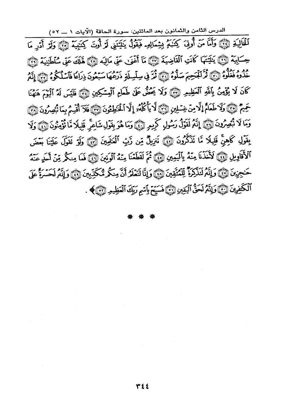 الْقَاضِيَةَ (27) مَا أَغْنَى عَنِّي مَالِيهْ (28) هَلَكَ عَنِّي سُلْطَانِيهْ (29) خُذُوهُ فَغُلُّوهُ (30) ثُمَّ الْجَحِيمَ صَلُّوهُ (31) ثُمَّ فِي سِلْسِلَةٍ ذَرْعُهَا سَبْعُونَ ذِرَاعاً فَاسْلُكُوهُ (32) إِنَّهُ كَانَ لَا يُؤْمِنُ بِاللَّهِ الْعَظِيمِ (33) وَلَا يَحُضُّ عَلَى طَعَامِ الْمِسْكِينِ (34) فَلَيْسَ لَهُ الْيَوْمَ هَاهُنَا حَمِيمٌ (35) وَلَا طَعَامٌ إِلَّا مِنْ غِسْلِينٍ (36) لَا يَأْكُلُهُ إِلَّا الْخَاطِؤُونَ (37) فَلَا أُقْسِمُ بِمَا تُبْصِرُونَ (38) وَمَا لَا تُبْصِرُونَ (39) إِنَّهُ لَقَوْلُ رَسُولٍ كَرِيمٍ (40) وَمَا هُوَ بِقَوْلِ شَاعِرٍ قَلِيلاً مَا تُؤْمِنُونَ (41) وَلَا بِقَوْلِ كَاهِنٍ قَلِيلاً مَا تَذَكَّرُونَ (42) تَنزِيلٌ مِّن رَّبِّ الْعَالَمِينَ (43) وَلَوْ تَقَوَّلَ عَلَيْنَا بَعْضَ الْأَقَاوِيلِ (44) لَأَخَذْنَا مِنْهُ بِالْيَمِينِ (45) ثُمَّ لَقَطَعْنَا مِنْهُ الْوَتِينَ (46) فَمَا مِنكُم مِّنْ أَحَدٍ عَنْهُ حَاجِزِينَ (47) وَإِنَّهُ لَتَذْكِرَةٌ لِّلْمُتَّقِينَ (48) وَإِنَّا لَنَعْلَمُ أَنَّ مِنكُم مُّكَذِّبِينَ (49) وَإِنَّهُ لَحَسْرَةٌ عَلَى الْكَافِرِينَ (50) وَإِنَّهُ لَحَقُّ الْيَقِينِ (51) فَسَبِّحْ بِاسْمِ رَبِّكَ الْعَظِيمِ (52) } .
