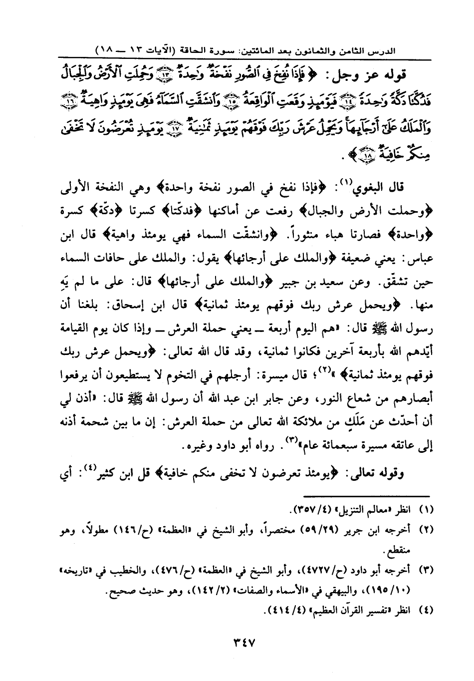 قال البغوي: {فَإِذَا نُفِخَ فِي الصُّورِ نَفْخَةٌ وَاحِدَةٌ} وهي: النفخة الأولى {وَحُمِلَتِ الْأَرْضُ وَالْجِبَالُ} رفعت عن أماكنها {فَدُكَّتَا} كسرتا {دَكَّةً} كسرة {وَاحِدَةً} فصارتا هباء منثورًا {وَانشَقَّتِ السَّمَاء فَهِيَ يَوْمَئِذٍ وَاهِيَةٌ} قال ابن عباس: يعني ضعيفة {وَالْمَلَكُ عَلَى أَرْجَائِهَا} يقول: والملك على حافات السماء حين تشقّق. وعن سعيد بن جبير: {وَالْمَلَكُ عَلَى أَرْجَائِهَا} قال: على ما لم يَهِ منها. ... {وَيَحْمِلُ عَرْشَ رَبِّكَ فَوْقَهُمْ يَوْمَئِذٍ ثَمَانِيَةٌ} ، قال ابن إسحاق: بلغنا أن رسول الله - صلى الله عليه وسلم - قال: «هم اليوم أربعة - يعني: حملة العرش - وإذا كان يوم القيامة أيّدهم الله بأربعة آخرين فكانوا ثمانية، وقد قال الله تعالى: {وَيَحْمِلُ عَرْشَ رَبِّكَ فَوْقَهُمْ يَوْمَئِذٍ ثَمَانِيَةٌ} » ؛ قال ميسرة: أرجلهم في التخوم لا يستطيعون أن يرفعوا أبصارهم من شعاع النور. وعن جابر ابن عبد الله أن رسول الله - صلى الله عليه وسلم - قال: «أذن لي أن أحدّث عن