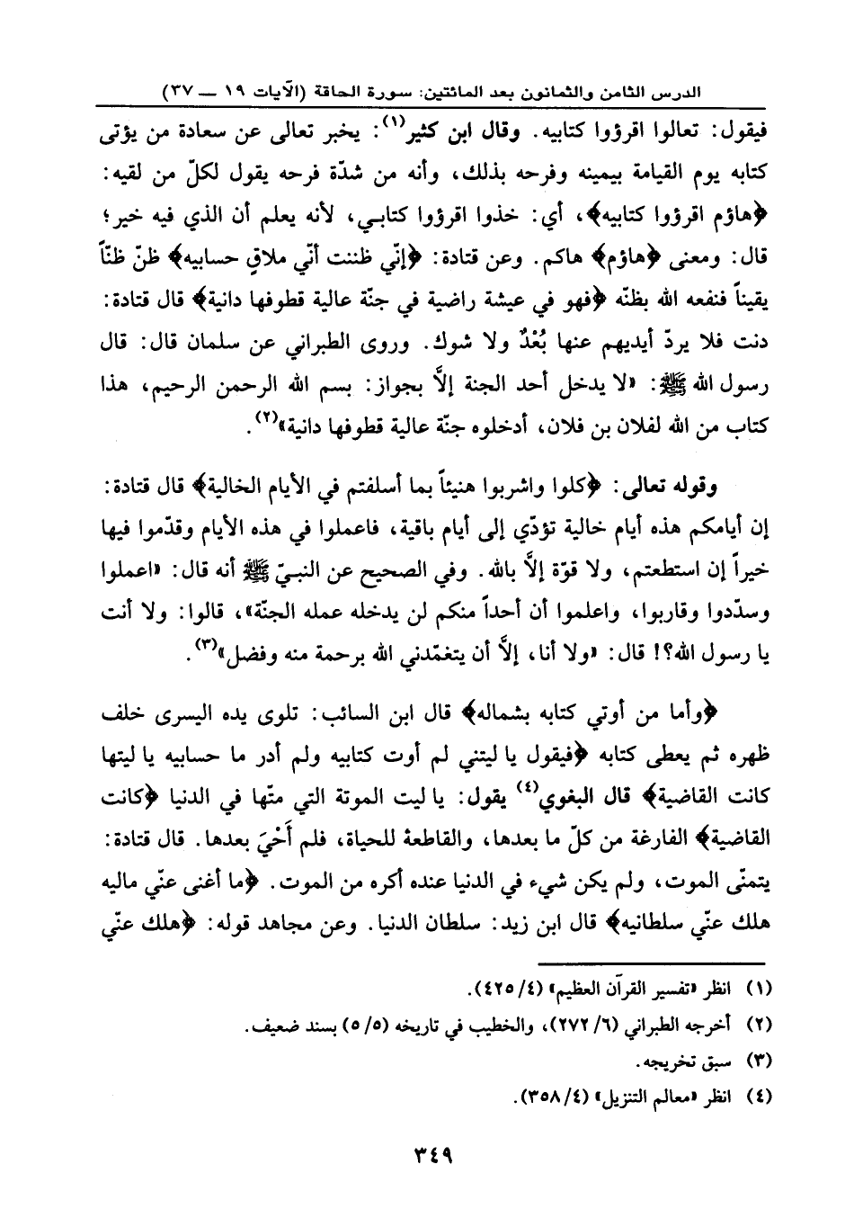 فيقول: تعالوا اقرؤوا كتابيه. وقال ابن كثير: يخبر تعالى عن سعادة من يؤتى كتابه يوم القيامة بيمينه وفرحه بذلك، وأنه من شدّة فرحه يقول لكلّ من لقيه: {هَاؤُمُ اقْرَؤُوا كِتَابِيهْ} ، أي: خذوا اقرؤوا كتابي، لأنه يعلم أن الذي فيه خير؛ قال: ومعنى: {هَاؤُمُ} هاكم. وعن قتادة: {إِنِّي ظَنَنتُ أَنِّي مُلَاقٍ حِسَابِيهْ} ظنّ ظنًّا يقينًا فنفعه الله بظنّه، {فَهُوَ فِي عِيشَةٍ رَّاضِيَةٍ * فِي جَنَّةٍ عَالِيَةٍ * قُطُوفُهَا دَانِيَةٌ} . قال قتادة: دنت فلا يردّ أيديهم عنها بُعْدٌ ولا شوك. وروى الطبراني عن سلمان قال: قال رسول الله - صلى الله عليه وسلم -: «لا يدخل أحد الجنة إلا بجواز: بسم الله الرحمن الرحيم، هذا كتاب من الله لفلان بن فلان، أدخلوه جنّة عالية قطوفها دانية» .
