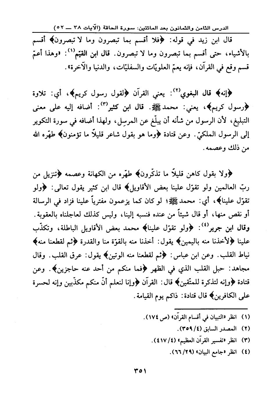 {وَلَا بِقَوْلِ كَاهِنٍ قَلِيلاً مَا تَذَكَّرُونَ} طهّره من الكهانة وعصمه، {تَنزِيلٌ مِّن رَّبِّ الْعَالَمِينَ * وَلَوْ تَقَوَّلَ عَلَيْنَا بَعْضَ الْأَقَاوِيلِ} ، قال ابن كثير: يقول تعالى: {وَلَوْ تَقَوَّلَ عَلَيْنَا} ، أي: محمد - صلى الله عليه وسلم -؛ لو كان كما يزعمون مفتريًا علينا فزاد في الرسالة أو نقص منها، أو قال شيئًا من عنده فنسبه إلينا، وليس كذلك لعاجلناه بالعقوبة. وقال ابن جرير: {وَلَوْ تَقَوَّلَ عَلَيْنَا} محمد بعض الأقاويل الباطلة، وتكذّب علينا {لَأَخَذْنَا مِنْهُ بِالْيَمِينِ} يقول: أخذنا منه بالقوّة منا والقدرة {ثُمَّ لَقَطَعْنَا مِنْهُ} ، نياط القلب. وعن ابن عباس: {ثُمَّ لَقَطَعْنَا مِنْهُ الْوَتِينَ} يقول: عرق القلب. وقال مجاهد: حبل القلب الذي في الظهر {فَمَا مِنكُم مِّنْ أَحَدٍ عَنْهُ حَاجِزِينَ} . وعن قتادة: {وَإِنَّهُ لَتَذْكِرَةٌ لِّلْمُتَّقِينَ} قال: القرآن. {وَإِنَّا لَنَعْلَمُ أَنَّ مِنكُم مُّكَذِّبِينَ * وَإِنَّهُ لَحَسْرَةٌ عَلَى الْكَافِرِينَ} قال قتادة: ذاكم يوم القيامة.