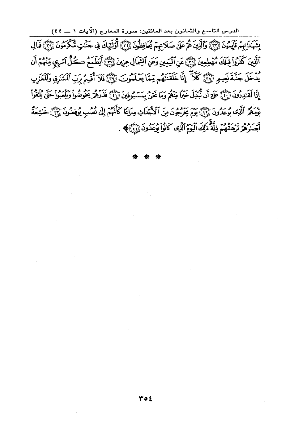 بِشَهَادَاتِهِمْ قَائِمُونَ (33) وَالَّذِينَ هُمْ عَلَى صَلَاتِهِمْ يُحَافِظُونَ (34) أُوْلَئِكَ فِي جَنَّاتٍ مُّكْرَمُونَ (35) فَمَالِ الَّذِينَ كَفَرُوا قِبَلَكَ مُهْطِعِينَ (36) عَنِ الْيَمِينِ وَعَنِ الشِّمَالِ عِزِينَ (37) أَيَطْمَعُ كُلُّ امْرِئٍ مِّنْهُمْ أَن يُدْخَلَ جَنَّةَ نَعِيمٍ (38) كَلَّا إِنَّا خَلَقْنَاهُم مِّمَّا يَعْلَمُونَ (39) فَلَا أُقْسِمُ بِرَبِّ الْمَشَارِقِ وَالْمَغَارِبِ إِنَّا لَقَادِرُونَ (40) عَلَى أَن نُّبَدِّلَ خَيْراً مِّنْهُمْ وَمَا نَحْنُ بِمَسْبُوقِينَ (41) فَذَرْهُمْ يَخُوضُوا وَيَلْعَبُوا حَتَّى يُلَاقُوا يَوْمَهُمُ الَّذِي يُوعَدُونَ (42) يَوْمَ يَخْرُجُونَ مِنَ الْأَجْدَاثِ سِرَاعاً كَأَنَّهُمْ إِلَى نُصُبٍ يُوفِضُونَ (43) خَاشِعَةً أَبْصَارُهُمْ تَرْهَقُهُمْ ذِلَّةٌ ذَلِكَ الْيَوْمُ الَّذِي كَانُوا يُوعَدُونَ (44) }