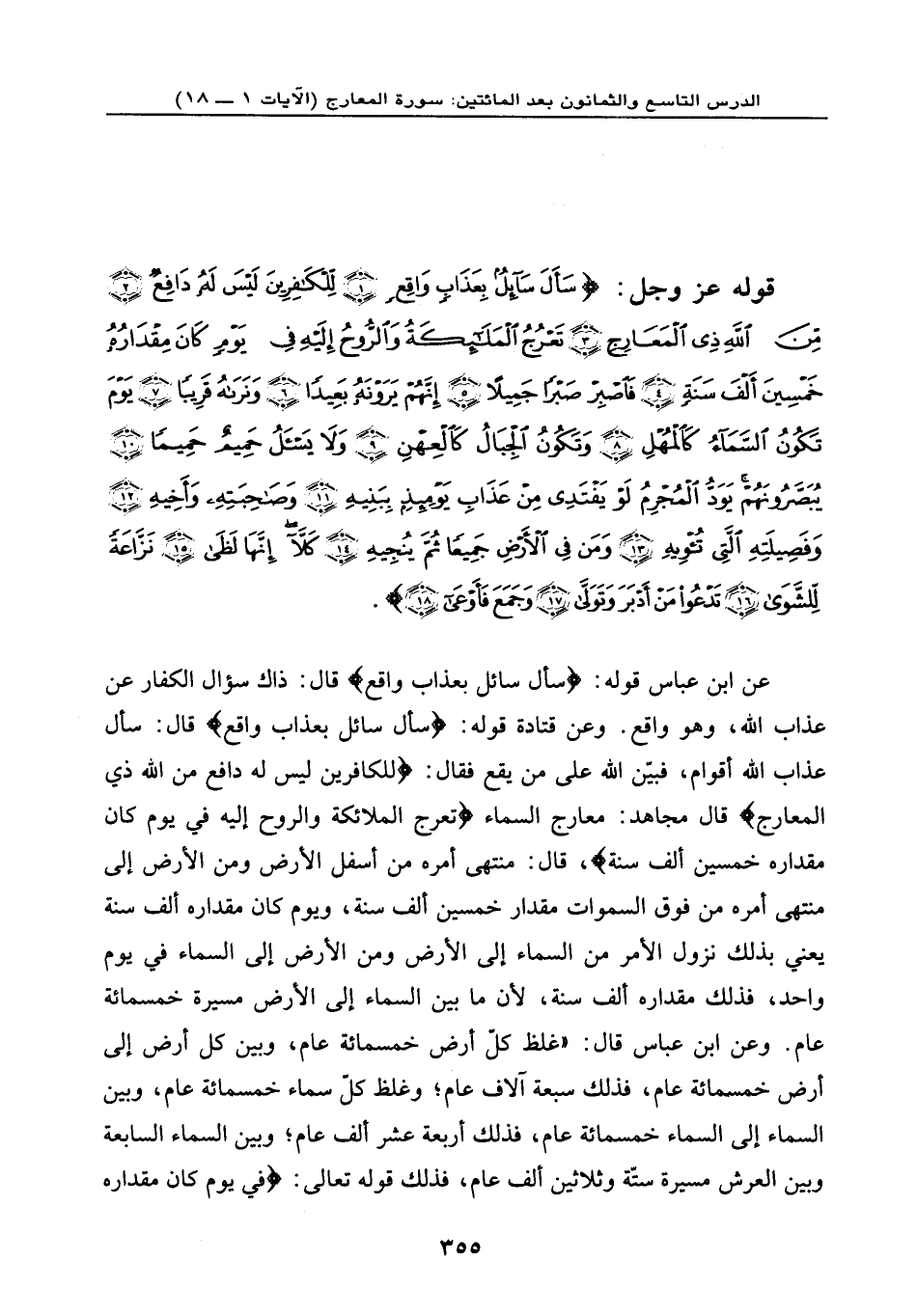 قوله عز وجل: {سَأَلَ سَائِلٌ بِعَذَابٍ وَاقِعٍ (1) لِّلْكَافِرينَ لَيْسَ لَهُ دَافِعٌ (2) مِّنَ اللَّهِ ذِي الْمَعَارِجِ (3) تَعْرُجُ الْمَلَائِكَةُ وَالرُّوحُ إِلَيْهِ فِي يَوْمٍ كَانَ مِقْدَارُهُ خَمْسِينَ أَلْفَ سَنَةٍ (4) فَاصْبِرْ صَبْراً جَمِيلاً (5) إِنَّهُمْ يَرَوْنَهُ بَعِيداً (6) وَنَرَاهُ قَرِيباً (7) يَوْمَ تَكُونُ السَّمَاء كَالْمُهْلِ (8) وَتَكُونُ الْجِبَالُ كَالْعِهْنِ (9) وَلَا يَسْأَلُ حَمِيمٌ حَمِيماً (10) يُبَصَّرُونَهُمْ يَوَدُّ الْمُجْرِمُ لَوْ يَفْتَدِي مِنْ عَذَابِ يَوْمِئِذٍ بِبَنِيهِ (11) وَصَاحِبَتِهِ وَأَخِيهِ (12) وَفَصِيلَتِهِ الَّتِي تُؤْويهِ (13) وَمَن فِي الْأَرْضِ جَمِيعاً ثُمَّ يُنجِيهِ (14) كَلَّا إِنَّهَا لَظَى (15) نَزَّاعَةً لِّلشَّوَى (16) تَدْعُو مَنْ أَدْبَرَ وَتَوَلَّى (17) وَجَمَعَ فَأَوْعَى (18) } .