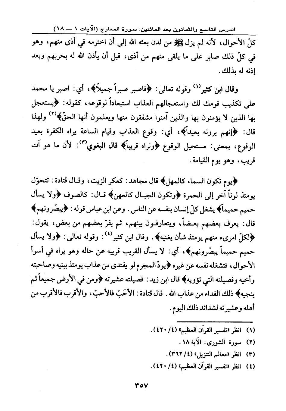 وقال ابن كثير: وقوله تعالى: {فَاصْبِرْ صَبْراً جَمِيلاً} ، أي: اصبر يا محمد على تكذيب قومك لك واستعجالهم العذاب استبعادًا لوقوعه، كقوله: {يَسْتَعْجِلُ بِهَا الَّذِينَ لَا يُؤْمِنُونَ بِهَا وَالَّذِينَ آمَنُوا مُشْفِقُونَ مِنْهَا وَيَعْلَمُونَ أَنَّهَا الْحَقُّ} ولهذا قال: {إِنَّهُمْ يَرَوْنَهُ بَعِيداً} أي: وقوع العذاب وقيام الساعة يراه الكفرة بعيد الوقوع، بمعنى: مستحيل الوقوع، {وَنَرَاهُ قَرِيباً} ، قال البغوي: لأن ما هو آت قريب، وهو يوم القيامة.