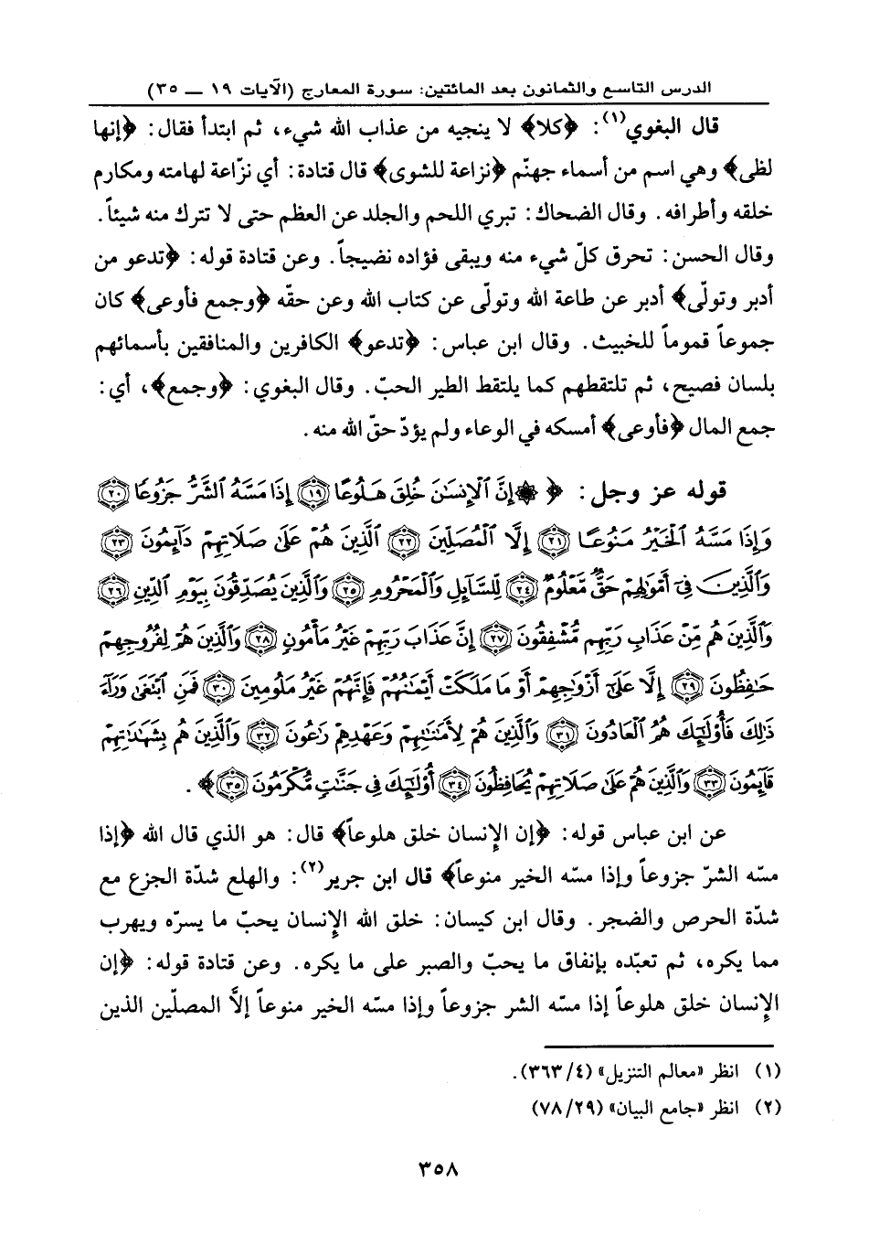 قوله عز وجل: {إِنَّ الْإِنسَانَ خُلِقَ هَلُوعاً (19) إِذَا مَسَّهُ الشَّرُّ جَزُوعاً (20) وَإِذَا مَسَّهُ الْخَيْرُ مَنُوعاً (21) إِلَّا الْمُصَلِّينَ (22) الَّذِينَ هُمْ عَلَى صَلَاتِهِمْ دَائِمُونَ (23) وَالَّذِينَ فِي أَمْوَالِهِمْ حَقٌّ مَّعْلُومٌ (24) لِّلسَّائِلِ وَالْمَحْرُومِ (25) وَالَّذِينَ يُصَدِّقُونَ بِيَوْمِ الدِّينِ (26) وَالَّذِينَ هُم مِّنْ عَذَابِ رَبِّهِم مُّشْفِقُونَ (27) إِنَّ عَذَابَ رَبِّهِمْ غَيْرُ مَأْمُونٍ (28)