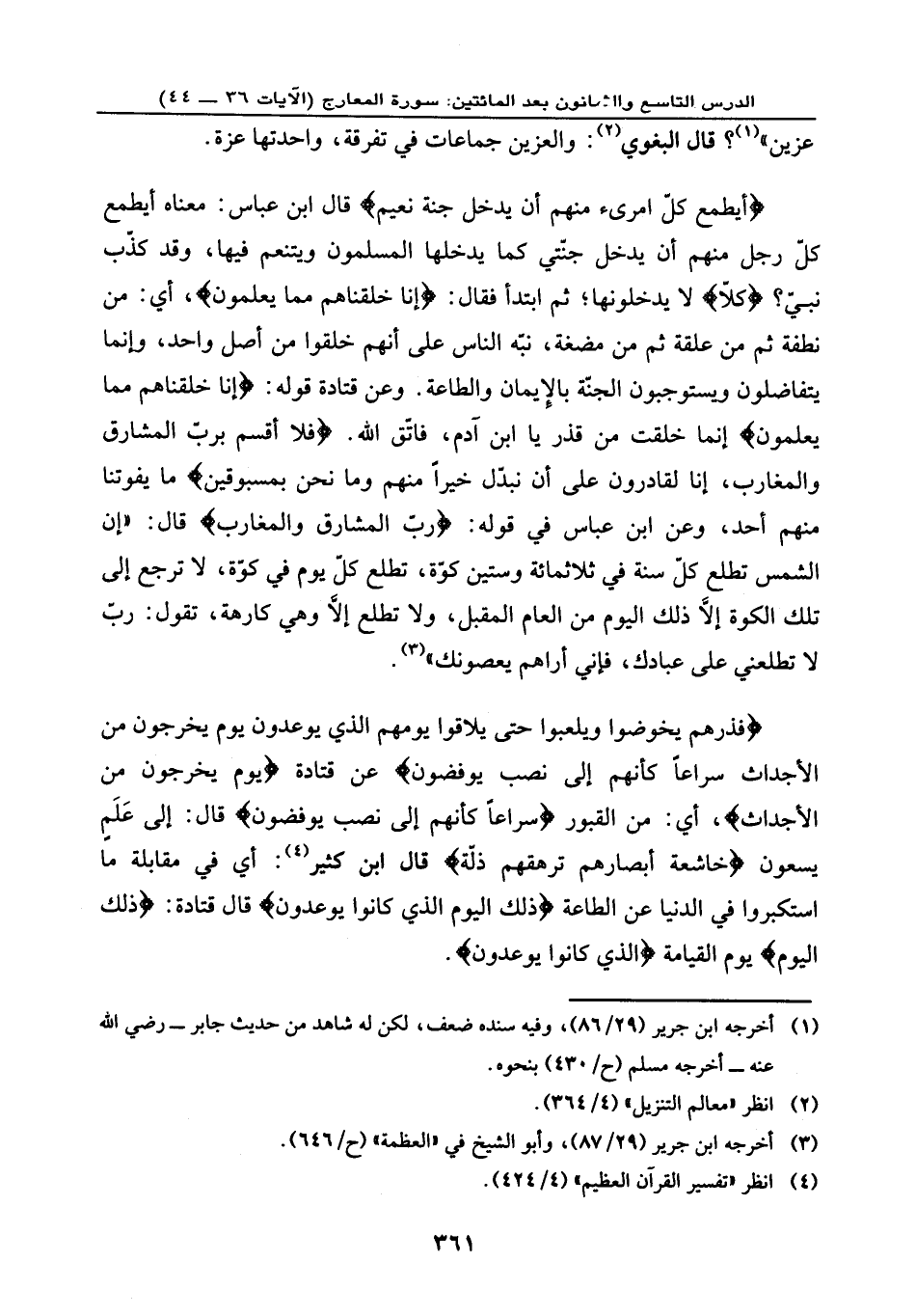 {فَذَرْهُمْ يَخُوضُوا وَيَلْعَبُوا حَتَّى يُلَاقُوا يَوْمَهُمُ الَّذِي يُوعَدُونَ * يَوْمَ يَخْرُجُونَ مِنَ الْأَجْدَاثِ سِرَاعاً كَأَنَّهُمْ إِلَى نُصُبٍ يُوفِضُونَ} عن قتادة: {يَوْمَ يَخْرُجُونَ مِنَ الْأَجْدَاثِ} ، أي: من القبور، {سِرَاعاً كَأَنَّهُمْ إِلَى نُصُبٍ يُوفِضُونَ} ، قال: إلى علم يسعون، {خَاشِعَةً أَبْصَارُهُمْ تَرْهَقُهُمْ ذِلَّةٌ} ، قال ابن كثير: أي: في مقابلة ما استكبروا في الدنيا عن الطاعة، {ذَلِكَ الْيَوْمُ الَّذِي كَانُوا يُوعَدُونَ} ، قال قتادة: {ذَلِكَ الْيَوْمُ} يوم القيامة {الَّذِي كَانُوا يُوعَدُونَ} .