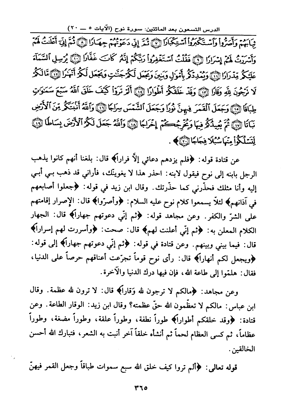 ثِيَابَهُمْ وَأَصَرُّوا وَاسْتَكْبَرُوا اسْتِكْبَاراً (7) ثُمَّ إِنِّي دَعَوْتُهُمْ جِهَاراً (8) ثُمَّ إِنِّي أَعْلَنتُ لَهُمْ وَأَسْرَرْتُ لَهُمْ إِسْرَاراً (9) فَقُلْتُ اسْتَغْفِرُوا رَبَّكُمْ إِنَّهُ كَانَ غَفَّاراً (10) يُرْسِلِ السَّمَاء عَلَيْكُم مِّدْرَاراً (11) وَيُمْدِدْكُمْ بِأَمْوَالٍ وَبَنِينَ وَيَجْعَل لَّكُمْ جَنَّاتٍ وَيَجْعَل لَّكُمْ أَنْهَاراً (12) مَّا لَكُمْ لَا تَرْجُونَ لِلَّهِ وَقَاراً (13) وَقَدْ خَلَقَكُمْ أَطْوَاراً (14) أَلَمْ تَرَوْا كَيْفَ خَلَقَ اللَّهُ سَبْعَ سَمَاوَاتٍ طِبَاقاً (15) وَجَعَلَ الْقَمَرَ فِيهِنَّ نُوراً وَجَعَلَ الشَّمْسَ سِرَاجاً (16) وَاللَّهُ أَنبَتَكُم مِّنَ الْأَرْضِ نَبَاتاً (17) ثُمَّ يُعِيدُكُمْ فِيهَا وَيُخْرِجُكُمْ إِخْرَاجاً (18) وَاللَّهُ جَعَلَ لَكُمُ الْأَرْضَ بِسَاطاً (19) لِتَسْلُكُوا مِنْهَا سُبُلاً فِجَاجاً (20) } .