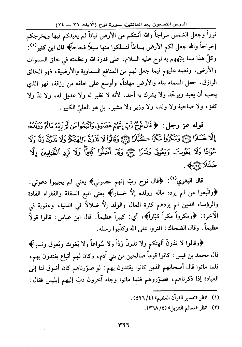 آلِهَتَكُمْ وَلَا تَذَرُنَّ وَدّاً وَلَا سُوَاعاً وَلَا يَغُوثَ وَيَعُوقَ وَنَسْراً (23) وَقَدْ أَضَلُّوا كَثِيراً وَلَا تَزِدِ الظَّالِمِينَ إِلَّا ضَلَالاً (24) } .