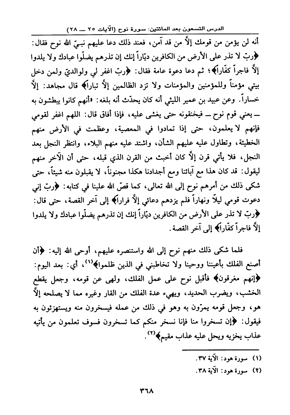 دَخَلَ بَيْتِيَ مُؤْمِناً وَلِلْمُؤْمِنِينَ وَالْمُؤْمِنَاتِ وَلَا تَزِدِ الظَّالِمِينَ إِلَّا تَبَاراً} ، قال مجاهد: إلا خسارًا. وعن عبيد بن عمير الليثي أنه كان يحدّث أنه بلغه: (أنهم كانوا يبطشون به -، يعني: قوم نوح - فيخنقونه حتى يغشى عليه، فإذا أفاق قال: اللهم اغفر لقومي فإنهم لا يعلمون حتى إذا تمادوا في المعصية، وعظمت في الأرض منهم الخطيئة، وتطاول عليه عليهم الشأن، واشتد عليهم من البلاء، وانتظر النجل بعد النجل، فلا يأتي قرن إلا كان أخبث من القرن الذي قبله، حتى إن كان الآخر منهم ليقول: قد كان هذا مع آبائنا وأجدادنا هكذا مجنونًا، لا يقبلون منه شيئًا، حتى شكى ذلك من أمرهم نوح إلى الله تعالى، كما قص الله علينا في كتابه: {رَبِّ إِنِّي دَعَوْتُ قَوْمِي لَيْلاً وَنَهَاراً * فَلَمْ يَزِدْهُمْ دُعَائِي إِلَّا فِرَاراً} إلى آخر القصة، حتى قال: {رَّبِّ لَا تَذَرْ عَلَى الْأَرْضِ مِنَ الْكَافِرِينَ دَيَّاراً * إِنَّكَ إِن تَذَرْهُمْ يُضِلُّوا عِبَادَكَ وَلَا يَلِدُوا إِلَّا فَاجِراً كَفَّاراً} إلى آخر القصة.