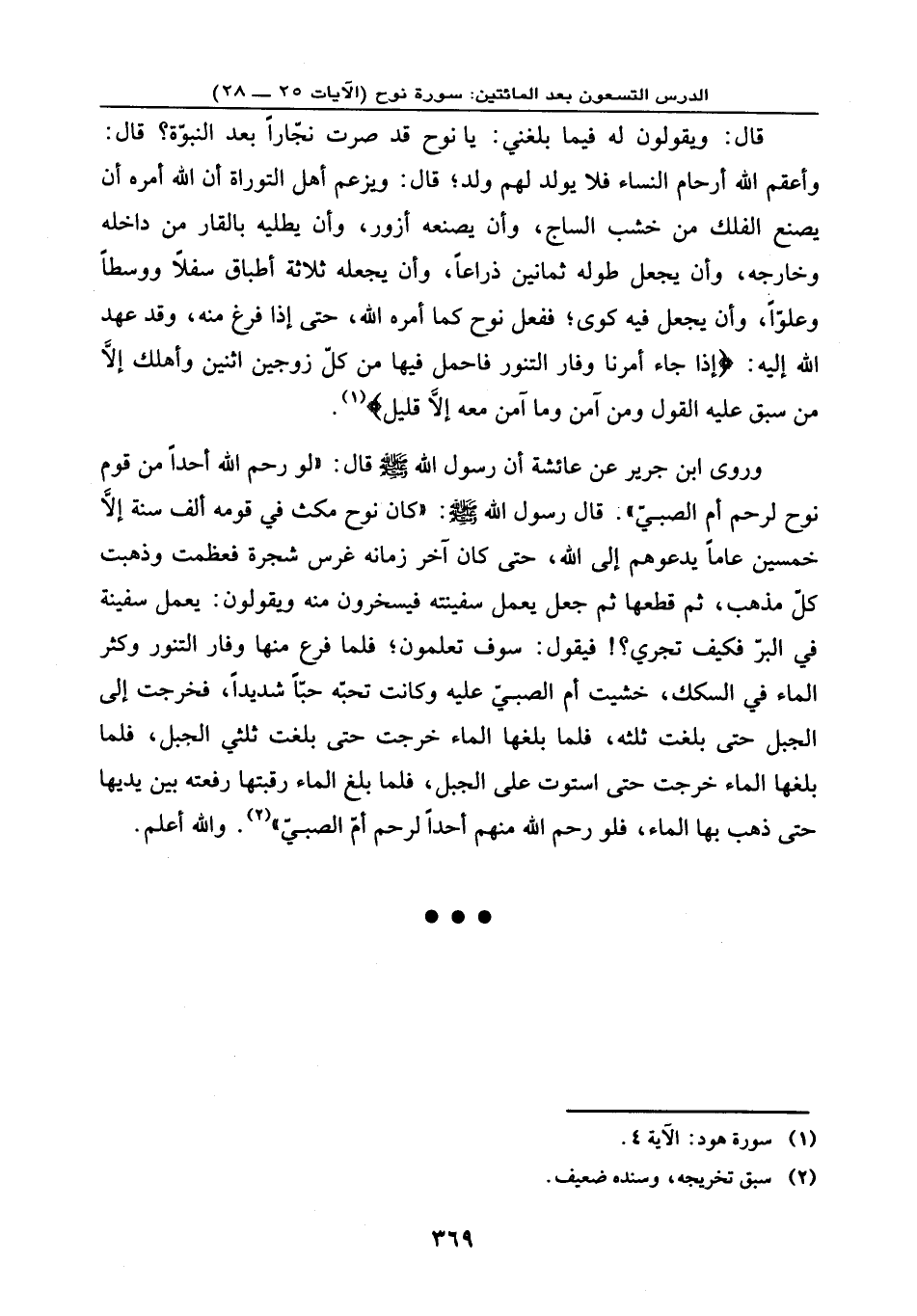 وروى ابن جرير عن عائشة أن رسول الله - صلى الله عليه وسلم - قال: «لو رحم الله أحدًا من قوم نوح لرحم أم الصبي» ، قال رسول الله - صلى الله عليه وسلم -: «كان نوح مكث في قومه ألف سنة إلا خمسين عامًا يدعوهم إلى الله، حتى كان آخر زمانه وغرس شجرة فعظمت وذهبت كل مذهب، ثم قطعها ثم جعل يعمل سفينته فيسخرون منه ويقولون: يعمل سفينة في البر فكيف تجري؟ فيقول: سوف تعلمون؛ فلما فرغ منها وفار التنور وكثر الماء في السكك، خشيت أم الصبي عليه وكانت تحبه حبًا شديدًا، فخرجت إلى الجبل حتى بلغت ثلثه، فلما بلغها الماء خرجت حتى بلغت ثلثي الجبل، فلما بلغها الماء خرجت حتى استوت على الجبل، فلما بلغ الماء رقبتها