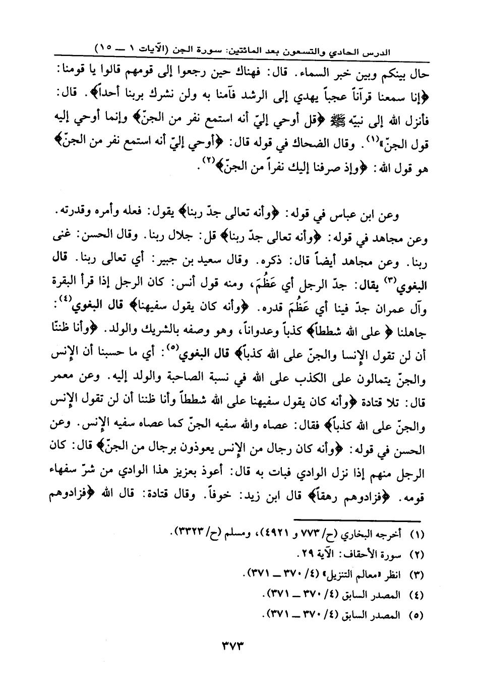وعن ابن عباس في قوله: {وَأَنَّهُ تَعَالَى جَدُّ رَبِّنَا} يقول: فعله وأمره وقدرته، وعن مجاهد في قوله: {وَأَنَّهُ تَعَالَى جَدُّ رَبِّنَا} قل جلال ربنا، وقال الحسن: غنى ربنا. وعن مجاهد أيضًا: قال: ذكره، وقال سعيد بن جبير: أي: تعالى ربنا. قال البغوي يقال: جد الرجل أي: عظم، ومنه قول أنس: كان الرجل إذا قرأ البقرة، وآل عمران جد فينا، أي: عظم قدره. {وَأَنَّهُ كَانَ يَقُولُ سَفِيهُنَا} ، قال البغوي جاهلنا {عَلَى اللَّهِ شَطَطاً} كذبًا وعدوانًا، وهو وصفه بالشريك والولد. {وَأَنَّا ظَنَنَّا أَن لَّن تَقُولَ الْإِنسُ وَالْجِنُّ عَلَى اللَّهِ كَذِباً} ، قال البغوي: أي: ما حسبنا أن الإنس والجن يتمالون على الكذب على الله في نسبة الصاحبة والولد إليه. وعن معمر: قال: تلا قتادة: {وَأَنَّهُ كَانَ يَقُولُ سَفِيهُنَا عَلَى اللَّهِ شَطَطاً * وَأَنَّا ظَنَنَّا أَن لَّن تَقُولَ الْإِنسُ وَالْجِنُّ عَلَى اللَّهِ كَذِباً} ، فقال: عصاه والله سفيه الجن كما عصاه سفيه الإنس. وعن الحسن في