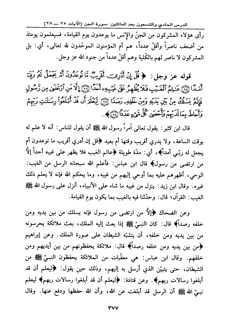 قوله عز وجل: {قُلْ إِنْ أَدْرِي أَقَرِيبٌ مَّا تُوعَدُونَ أَمْ يَجْعَلُ لَهُ رَبِّي أَمَداً (25) عَالِمُ الْغَيْبِ فَلَا يُظْهِرُ عَلَى غَيْبِهِ أَحَداً (26) إِلَّا مَنِ ارْتَضَى مِن رَّسُولٍ فَإِنَّهُ يَسْلُكُ مِن بَيْنِ يَدَيْهِ وَمِنْ خَلْفِهِ رَصَداً (27) لِيَعْلَمَ أَن قَدْ أَبْلَغُوا رِسَالَاتِ رَبِّهِمْ وَأَحَاطَ بِمَا لَدَيْهِمْ وَأَحْصَى كُلَّ شَيْءٍ عَدَداً (28) } .