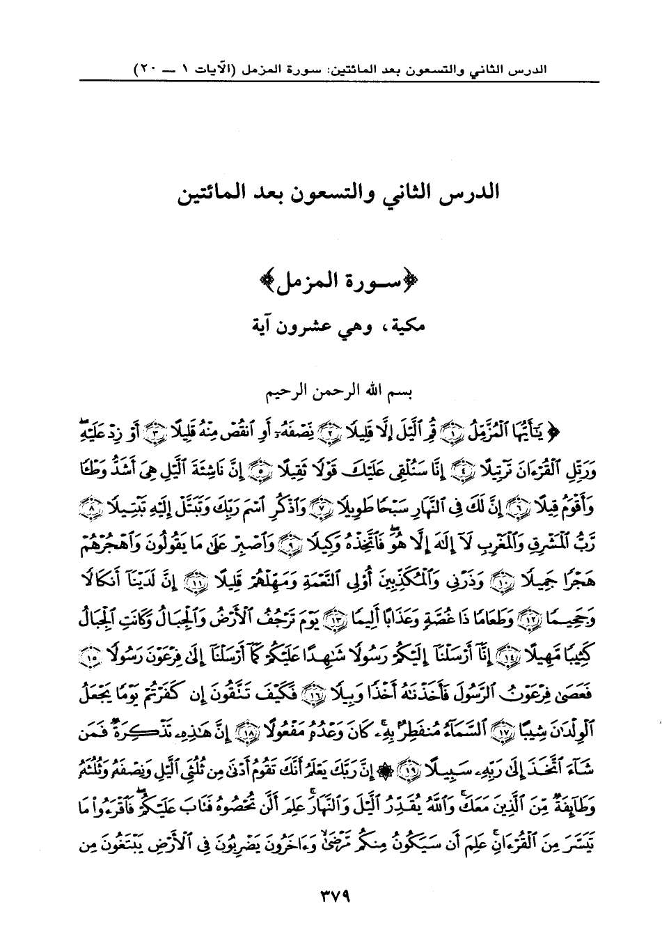 {يَا أَيُّهَا الْمُزَّمِّلُ (1) قُمِ اللَّيْلَ إِلَّا قَلِيلاً (2) نِصْفَهُ أَوِ انقُصْ مِنْهُ قَلِيلاً (3) أَوْ زِدْ عَلَيْهِ وَرَتِّلِ الْقُرْآنَ تَرْتِيلاً (4) إِنَّا سَنُلْقِي عَلَيْكَ قَوْلاً ثَقِيلاً (5) إِنَّ نَاشِئَةَ اللَّيْلِ هِيَ أَشَدُّ وَطْءاً وَأَقْوَمُ قِيلاً (6) إِنَّ لَكَ فِي اَلنَّهَارِ سَبْحاً طَوِيلاً (7) وَاذْكُرِ اسْمَ رَبِّكَ وَتَبَتَّلْ إِلَيْهِ تَبْتِيلاً (8) رَبُّ الْمَشْرِقِ وَالْمَغْرِبِ لَا إِلَهَ إِلَّا هُوَ فَاتَّخِذْهُ وَكِيلاً (9) وَاصْبِرْ عَلَى مَا يَقُولُونَ وَاهْجُرْهُمْ هَجْراً جَمِيلاً (10) وَذَرْنِي وَالْمُكَذِّبِينَ أُولِي النَّعْمَةِ وَمَهِّلْهُمْ قَلِيلاً (11) إِنَّ لَدَيْنَا أَنكَالاً وَجَحِيماً (12) وَطَعَاماً ذَا غُصَّةٍ وَعَذَاباً أَلِيماً (13) يَوْمَ تَرْجُفُ الْأَرْضُ وَالْجِبَالُ وَكَانَتِ الْجِبَالُ كَثِيباً مَّهِيلاً (14) إِنَّا أَرْسَلْنَا إِلَيْكُمْ رَسُولاً شَاهِداً عَلَيْكُمْ كَمَا أَرْسَلْنَا إِلَى فِرْعَوْنَ رَسُولاً (15) فَعَصَى فِرْعَوْنُ الرَّسُولَ فَأَخَذْنَاهُ أَخْذاً وَبِيلاً (16) فَكَيْفَ تَتَّقُونَ إِن كَفَرْتُمْ يَوْماً يَجْعَلُ الْوِلْدَانَ شِيباً (17) السَّمَاء مُنفَطِرٌ بِهِ كَانَ وَعْدُهُ مَفْعُولاً (18) إِنَّ هَذِهِ تَذْكِرَةٌ فَمَن شَاء اتَّخَذَ إِلَى رَبِّهِ سَبِيلاً (19) إِنَّ رَبَّكَ يَعْلَمُ أَنَّكَ تَقُومُ أَدْنَى مِن ثُلُثَيِ اللَّيْلِ وَنِصْفَهُ وَثُلُثَهُ وَطَائِفَةٌ مِّنَ الَّذِينَ مَعَكَ وَاللَّهُ يُقَدِّرُ اللَّيْلَ وَالنَّهَارَ عَلِمَ أَن لَّن تُحْصُوهُ فَتَابَ عَلَيْكُمْ فَاقْرَؤُوا مَا تَيَسَّرَ مِنَ الْقُرْآنِ عَلِمَ أَن سَيَكُونُ مِنكُم مَّرْضَى
