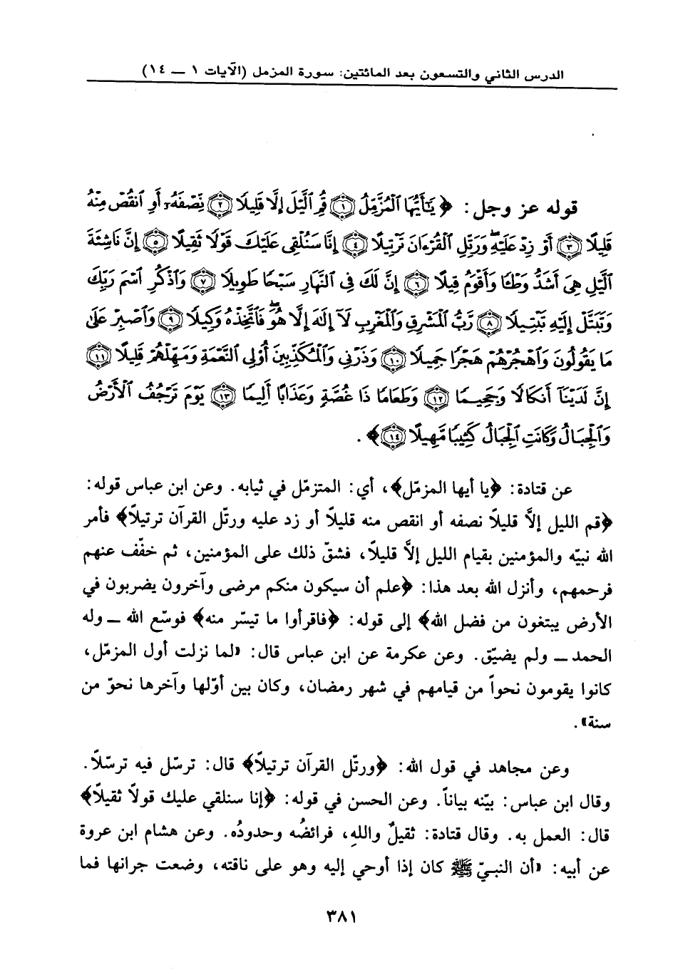 قوله عز وجل: {يَا أَيُّهَا الْمُزَّمِّلُ (1) قُمِ اللَّيْلَ إِلَّا قَلِيلاً (2) نِصْفَهُ أَوِ انقُصْ مِنْهُ قَلِيلاً (3) أَوْ زِدْ عَلَيْهِ وَرَتِّلِ الْقُرْآنَ تَرْتِيلاً (4) إِنَّا سَنُلْقِي عَلَيْكَ قَوْلاً ثَقِيلاً (5) إِنَّ نَاشِئَةَ اللَّيْلِ هِيَ أَشَدُّ وَطْءاً وَأَقْوَمُ قِيلاً (6) إِنَّ لَكَ فِي اَلنَّهَارِ سَبْحاً طَوِيلاً (7) وَاذْكُرِ اسْمَ رَبِّكَ وَتَبَتَّلْ إِلَيْهِ تَبْتِيلاً (8) رَبُّ الْمَشْرِقِ وَالْمَغْرِبِ لَا إِلَهَ إِلَّا هُوَ فَاتَّخِذْهُ وَكِيلاً (9) وَاصْبِرْ عَلَى مَا يَقُولُونَ وَاهْجُرْهُمْ هَجْراً جَمِيلاً (10) وَذَرْنِي وَالْمُكَذِّبِينَ أُولِي النَّعْمَةِ وَمَهِّلْهُمْ قَلِيلاً (11) إِنَّ لَدَيْنَا أَنكَالاً وَجَحِيماً (12) وَطَعَاماً ذَا غُصَّةٍ وَعَذَاباً أَلِيماً (13) يَوْمَ تَرْجُفُ الْأَرْضُ وَالْجِبَالُ وَكَانَتِ الْجِبَالُ كَثِيباً مَّهِيلاً (14) } .
