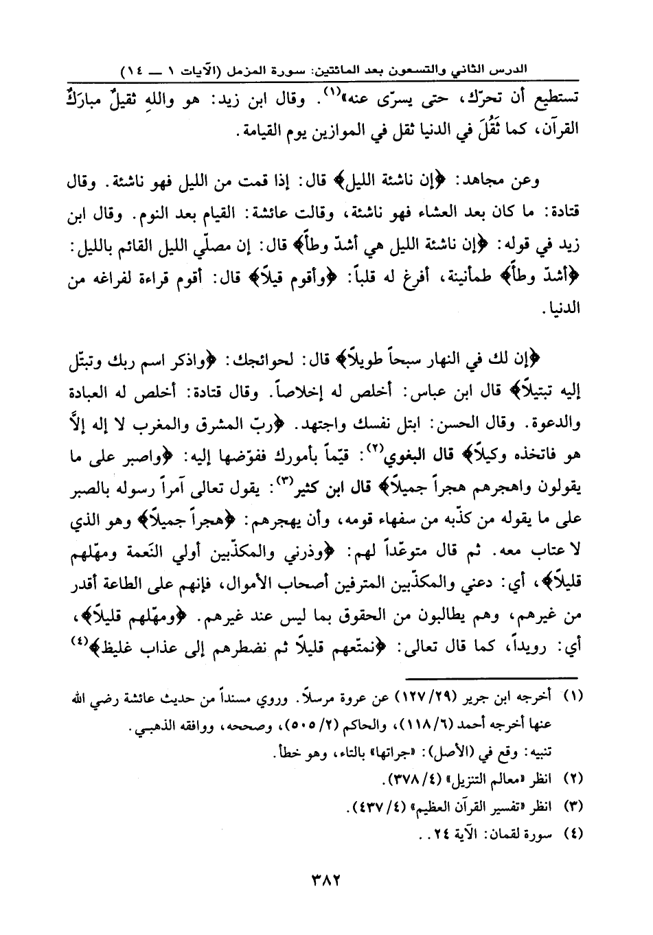 وعن مجاهد: {إِنَّ نَاشِئَةَ اللَّيْلِ} ، قال: إذا قمت من الليل فهو ناشئة. وقال قتادة: ما كان بعد العشاء فهو ناشئة، وقالت عائشة: القيام بعد النوم. وقال ابن زيد في قوله: {إِنَّ نَاشِئَةَ اللَّيْلِ هِيَ أَشَدُّ وَطْءاً} ، قال: إن مصلّي الليل القائم بالليل {أَشَدُّ وَطْءاً} طمأنينة، أفرغ له قلبًا {وَأَقْوَمُ قِيلاً} ، قال: أقوم قراءة لفراغه من الدنيا.
