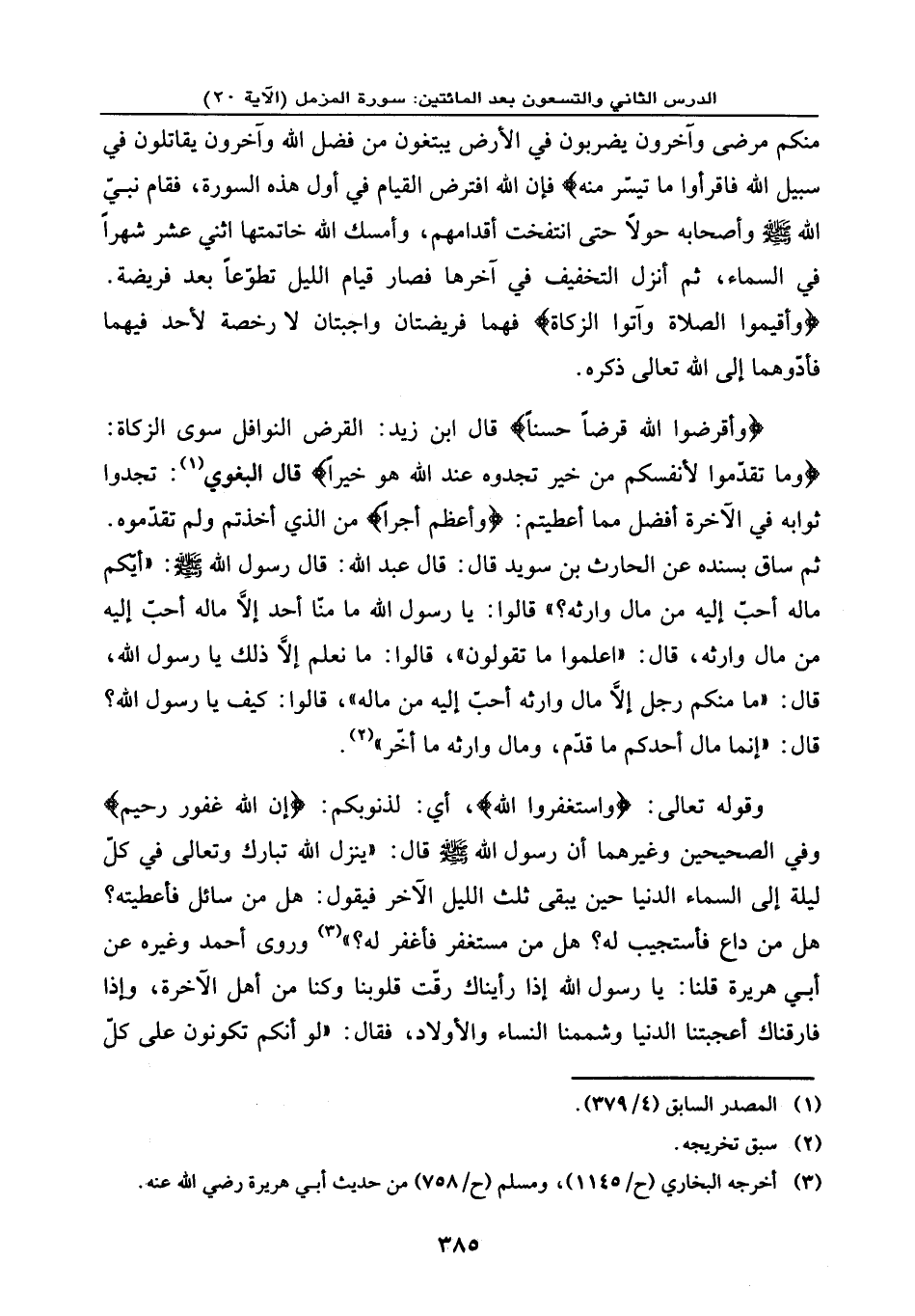 {وَأَقْرِضُوا اللَّهَ قَرْضاً حَسَناً} ، قال ابن زيد: القرض النوافل سوى الزكاة {وَمَا تُقَدِّمُوا لِأَنفُسِكُم مِّنْ خَيْرٍ تَجِدُوهُ عِندَ اللَّهِ هُوَ خَيْراً} ، قال البغوي: تجدوا ثوابه في الآخرة أفضل مما أعطيتم {وَأَعْظَمَ أَجْراً} من الذي أخذتم ولم تقدّموه. ثم ساق بسنده عن الحارث بن سويد قال: