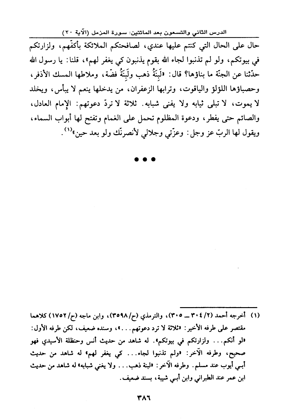 حال على الحال التي كنتم عليها عندي، لصافحنكم الملائكة بأكفّهم، ولزارتكم في بيوتكم، ولو لم تذنبوا لجاء الله بقوم يذنبون كي يغفر ... لهم» . قلنا: يا رسول الله حدّثنا عن الجنّة ما بناؤها؟ قال: «لَبِنَةُ ذهب ولَبِنَةُ فضّة، وملاطها المسك الأذفر، وحصباؤها اللؤلؤ والياقوت، وترابها الزعفران، من يدخلها ينعم لا يبأس، ويخلد لا يموت، لا تبلى ثيابه ولا يفنى شبابه. ثلاثة لا تردّ دعوتهم: الإمام العادل، والصائم حتى