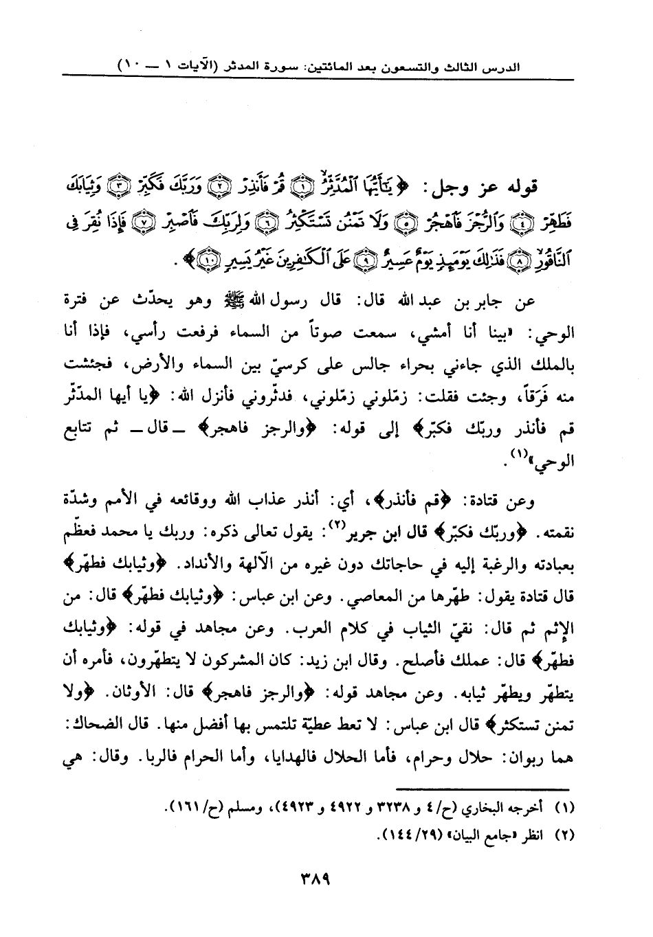 وعن قتادة: {قُمْ فَأَنذِرْ} ، أي: أنذر عذاب الله ووقائعه في الأمم وشدّة نقمته. {وَرَبَّكَ فَكَبِّرْ} ، قال ابن جرير: يقول تعالى ذكره: وربك يا محمد فعظّم بعبادته والرغبة إليه في حاجاتك دون غيره من الآلهة والأنداد. {وَثِيَابَكَ فَطَهِّرْ} ، قال قتادة: يقول: طهّرها من المعاصي. وعن ابن عباس: {وَثِيَابَكَ فَطَهِّرْ} ، قال: من الإِثم ثم قال: نقيّ الثياب في كلام العرب. وعن مجاهد في قوله: {وَثِيَابَكَ فَطَهِّرْ} ، قال: عملك فأصلح. وقال ابن زيد: كان المشركون لا يتطهّرون، فأمره أن يتطهّر ويطهّر ثيابه. وعن مجاهد: قوله: {وَالرُّجْزَ فَاهْجُرْ} ، قال: الأوثان. {وَلَا تَمْنُن تَسْتَكْثِرُ} ، قال ابن عباس: لا تعط عطيّة تلتمس بها أفضل منها. قال الضحاك: هما ربوان: حلال