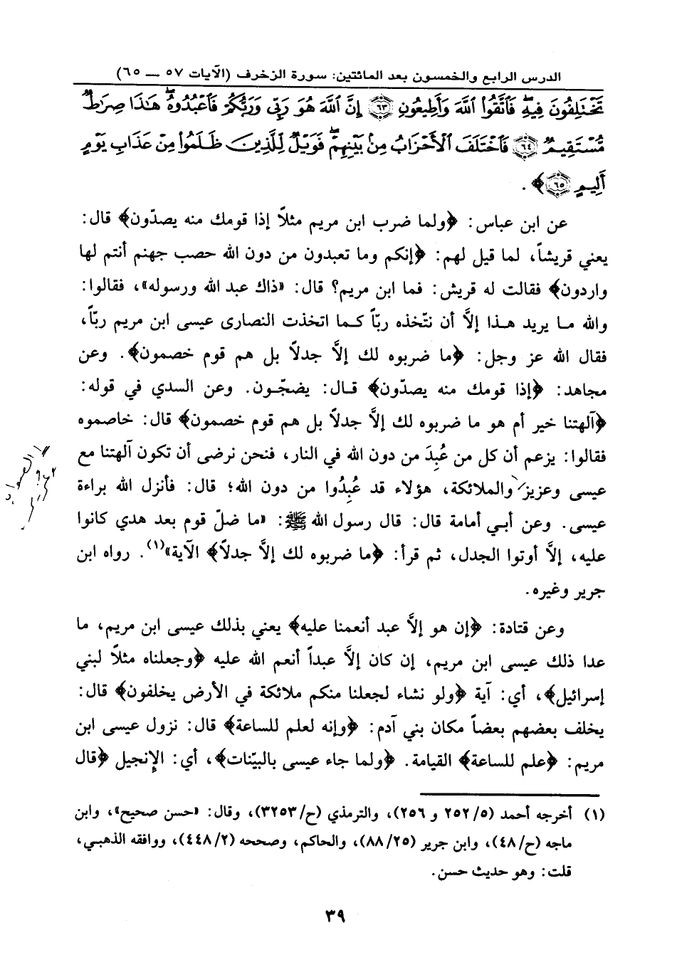عن ابن عباس: {وَلَمَّا ضُرِبَ ابْنُ مَرْيَمَ مَثَلاً إِذَا قَوْمُكَ مِنْهُ يَصِدُّونَ} قال: يعني: قريشًا لما قيل لهم: {إِنَّكُمْ وَمَا تَعْبُدُونَ مِن دُونِ اللَّهِ حَصَبُ جَهَنَّمَ أَنتُمْ لَهَا وَارِدُونَ} ، فقالت له قريش: فما ابن مريم؟ قال: «ذاك عبد الله ورسوله» ، فقالوا: والله ما يريد هذا إلا أن نتخذه ربًا كما اتخذت النصارى عيسى ابن مريم ربًا، فقال الله عز وجل: {مَا ضَرَبُوهُ لَكَ إِلَّا جَدَلاً بَلْ هُمْ قَوْمٌ خَصِمُونَ} . وعن مجاهد: {إِذَا قَوْمُكَ مِنْهُ يَصِدُّونَ} ، قال: يضجون. وعن السدي في قوله: ... {أَآلِهَتُنَا خَيْرٌ أَمْ هُوَ مَا ضَرَبُوهُ لَكَ إِلَّا جَدَلاً بَلْ هُمْ قَوْمٌ خَصِمُونَ} ، قال: خاصموه فقالوا: يزعم أن كل من عبد من دون الله في النار، فنحن نرضى أن تكون آلهتنا مع عيسى وعزير والملائكة، هؤلاء قد عبدوا من دون الله؛ قال: فأنزل الله براءة عيسى. وعن أبي أمامة قال: قال