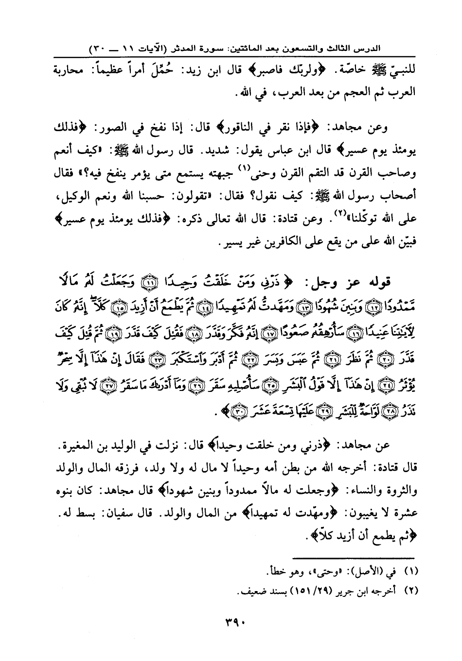 قوله عز وجل: {ذَرْنِي وَمَنْ خَلَقْتُ وَحِيداً (11) وَجَعَلْتُ لَهُ مَالاً مَّمْدُوداً (12) وَبَنِينَ شُهُوداً (13) وَمَهَّدتُّ لَهُ تَمْهِيداً (14) ثُمَّ يَطْمَعُ أَنْ أَزِيدَ (15) كَلَّا إِنَّهُ كَانَ لِآيَاتِنَا عَنِيداً (16) سَأُرْهِقُهُ صَعُوداً (17) إِنَّهُ فَكَّرَ وَقَدَّرَ (18) فَقُتِلَ كَيْفَ قَدَّرَ (19) ثُمَّ قُتِلَ كَيْفَ قَدَّرَ (20) ثُمَّ نَظَرَ (21) ثُمَّ عَبَسَ وَبَسَرَ (22) ثُمَّ أَدْبَرَ وَاسْتَكْبَرَ (23) فَقَالَ إِنْ هَذَا إِلَّا سِحْرٌ يُؤْثَرُ (24) إِنْ هَذَا إِلَّا قَوْلُ الْبَشَرِ (25) سَأُصْلِيهِ سَقَرَ (26) وَمَا أَدْرَاكَ مَا سَقَرُ (27) لَا تُبْقِي وَلَا تَذَرُ (28) لَوَّاحَةٌ لِّلْبَشَرِ (29) عَلَيْهَا تِسْعَةَ عَشَرَ (30) } .