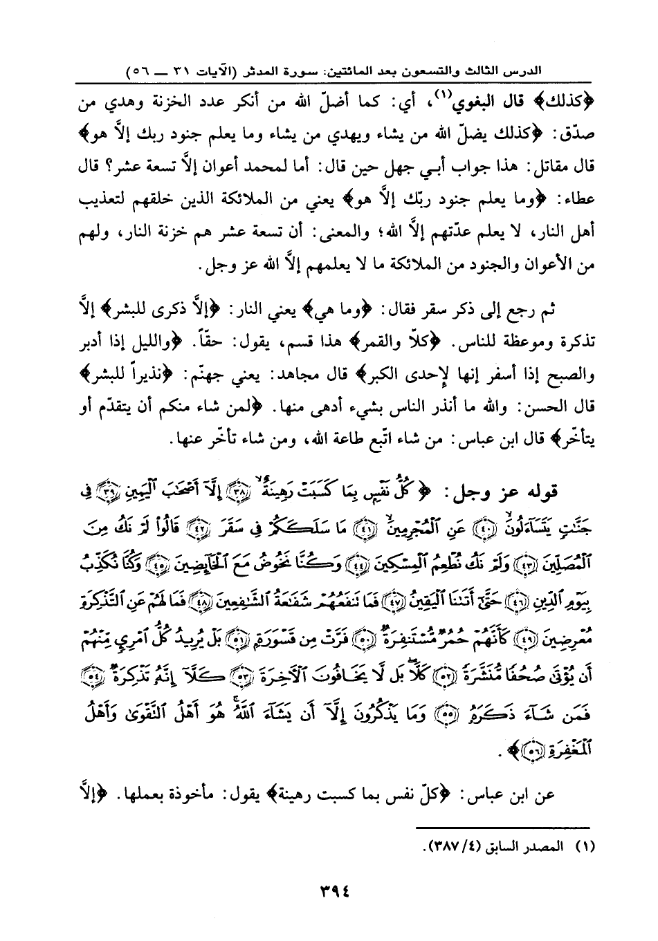 قوله عز وجل: {كُلُّ نَفْسٍ بِمَا كَسَبَتْ رَهِينَةٌ (38) إِلَّا أَصْحَابَ الْيَمِينِ (39) فِي جَنَّاتٍ يَتَسَاءلُونَ (40) عَنِ الْمُجْرِمِينَ (41) مَا سَلَكَكُمْ فِي سَقَرَ (42) قَالُوا لَمْ نَكُ مِنَ الْمُصَلِّينَ (43) وَلَمْ نَكُ نُطْعِمُ الْمِسْكِينَ (44) وَكُنَّا نَخُوضُ مَعَ الْخَائِضِينَ (45) وَكُنَّا نُكَذِّبُ بِيَوْمِ الدِّينِ (46) حَتَّى أَتَانَا الْيَقِينُ (47) فَمَا تَنفَعُهُمْ شَفَاعَةُ الشَّافِعِينَ (48) فَمَا لَهُمْ عَنِ التَّذْكِرَةِ مُعْرِضِينَ (49) كَأَنَّهُمْ حُمُرٌ مُّسْتَنفِرَةٌ (50) فَرَّتْ مِن قَسْوَرَةٍ (51) بَلْ يُرِيدُ كُلُّ امْرِئٍ مِّنْهُمْ أَن يُؤْتَى صُحُفاً مُّنَشَّرَةً (52) كَلَّا بَل لَا يَخَافُونَ الْآخِرَةَ (53) كَلَّا إِنَّهُ تَذْكِرَةٌ (54) فَمَن شَاء ذَكَرَهُ (55) وَمَا يَذْكُرُونَ إِلَّا أَن يَشَاءَ اللَّهُ هُوَ أَهْلُ التَّقْوَى وَأَهْلُ الْمَغْفِرَةِ (56) } .