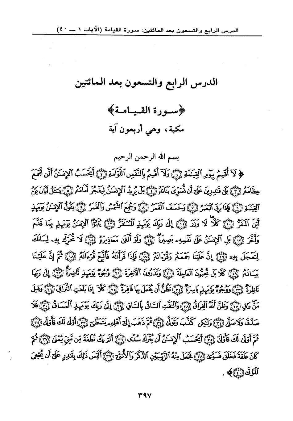 {لَا أُقْسِمُ بِيَوْمِ الْقِيَامَةِ (1) وَلَا أُقْسِمُ بِالنَّفْسِ اللَّوَّامَةِ (2) أَيَحْسَبُ الْإِنسَانُ أَلَّن نَجْمَعَ عِظَامَهُ (3) بَلَى قَادِرِينَ عَلَى أَن نُّسَوِّيَ بَنَانَهُ (4) بَلْ يُرِيدُ الْإِنسَانُ لِيَفْجُرَ أَمَامَهُ (5) يَسْأَلُ أَيَّانَ يَوْمُ الْقِيَامَةِ (6) فَإِذَا بَرِقَ الْبَصَرُ (7) وَخَسَفَ الْقَمَرُ (8) وَجُمِعَ الشَّمْسُ وَالْقَمَرُ (9) يَقُولُ الْإِنسَانُ يَوْمَئِذٍ أَيْنَ الْمَفَرُّ (10) كَلَّا لَا وَزَرَ (11) إِلَى رَبِّكَ يَوْمَئِذٍ الْمُسْتَقَرُّ (12) يُنَبَّأُ الْإِنسَانُ يَوْمَئِذٍ بِمَا قَدَّمَ وَأَخَّرَ (13) بَلِ الْإِنسَانُ عَلَى نَفْسِهِ بَصِيرَةٌ (14) وَلَوْ أَلْقَى مَعَاذِيرَهُ (15) لَا تُحَرِّكْ بِهِ لِسَانَكَ لِتَعْجَلَ بِهِ (16) إِنَّ عَلَيْنَا جَمْعَهُ وَقُرْآنَهُ (17) فَإِذَا قَرَأْنَاهُ فَاتَّبِعْ قُرْآنَهُ (18) ثُمَّ إِنَّ عَلَيْنَا بَيَانَهُ (19) كَلَّا بَلْ تُحِبُّونَ الْعَاجِلَةَ (20) وَتَذَرُونَ الْآخِرَةَ (21) وُجُوهٌ يَوْمَئِذٍ نَّاضِرَةٌ (22) إِلَى رَبِّهَا نَاظِرَةٌ (23) وَوُجُوهٌ يَوْمَئِذٍ بَاسِرَةٌ (24) تَظُنُّ أَن يُفْعَلَ بِهَا فَاقِرَةٌ (25) كَلَّا إِذَا بَلَغَتْ التَّرَاقِيَ (26) وَقِيلَ مَنْ رَاقٍ (27) وَظَنَّ أَنَّهُ الْفِرَاقُ (28) وَالْتَفَّتِ السَّاقُ بِالسَّاقِ (29) إِلَى رَبِّكَ يَوْمَئِذٍ الْمَسَاقُ (30) فَلَا صَدَّقَ وَلَا صَلَّى (31) وَلَكِن كَذَّبَ وَتَوَلَّى (32) ثُمَّ ذَهَبَ إِلَى أَهْلِهِ يَتَمَطَّى (33) أَوْلَى لَكَ فَأَوْلَى (34) ثُمَّ أَوْلَى لَكَ فَأَوْلَى (35) أَيَحْسَبُ