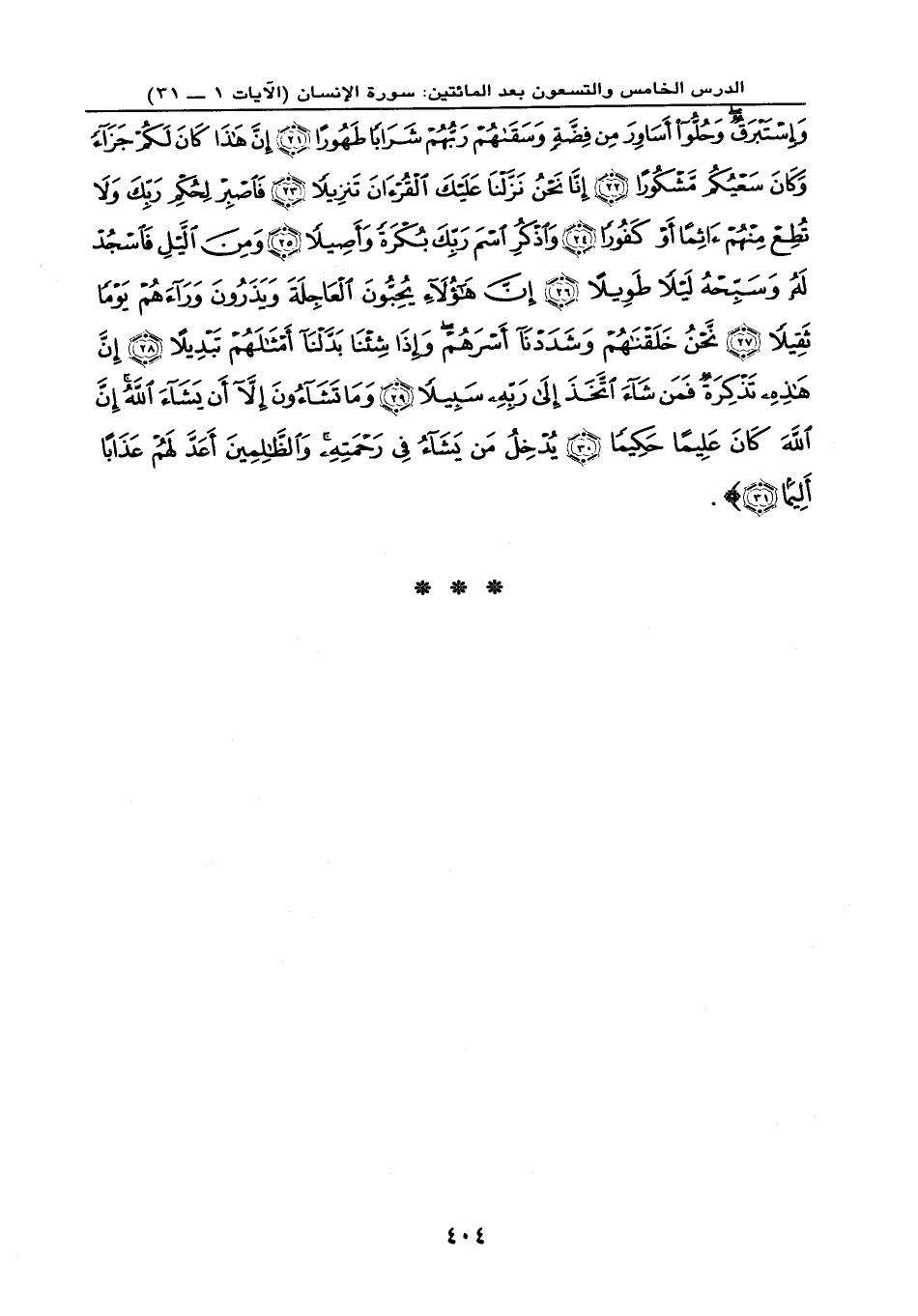 وَإِسْتَبْرَقٌ وَحُلُّوا أَسَاوِرَ مِن فِضَّةٍ وَسَقَاهُمْ رَبُّهُمْ شَرَاباً طَهُوراً (21) إِنَّ هَذَا كَانَ لَكُمْ جَزَاء وَكَانَ سَعْيُكُم مَّشْكُوراً (22) إِنَّا نَحْنُ نَزَّلْنَا عَلَيْكَ الْقُرْآنَ تَنزِيلاً (23) فَاصْبِرْ لِحُكْمِ رَبِّكَ وَلَا تُطِعْ مِنْهُمْ آثِماً أَوْ كَفُوراً (24) وَاذْكُرِ اسْمَ رَبِّكَ بُكْرَةً وَأَصِيلاً (25) وَمِنَ اللَّيْلِ فَاسْجُدْ لَهُ وَسَبِّحْهُ لَيْلاً طَوِيلاً (26) إِنَّ هَؤُلَاء يُحِبُّونَ الْعَاجِلَةَ وَيَذَرُونَ وَرَاءهُمْ يَوْماً ثَقِيلاً (27) نَحْنُ خَلَقْنَاهُمْ وَشَدَدْنَا أَسْرَهُمْ وَإِذَا شِئْنَا بَدَّلْنَا أَمْثَالَهُمْ تَبْدِيلاً (28) إِنَّ هَذِهِ تَذْكِرَةٌ فَمَن شَاء اتَّخَذَ إِلَى رَبِّهِ سَبِيلاً (29) وَمَا تَشَاؤُونَ إِلَّا أَن يَشَاءَ اللَّهُ إِنَّ اللَّهَ كَانَ عَلِيماً حَكِيماً (30) يُدْخِلُ مَن يَشَاءُ فِي رَحْمَتِهِ وَالظَّالِمِينَ أَعَدَّ لَهُمْ عَذَاباً أَلِيماً (31) } .