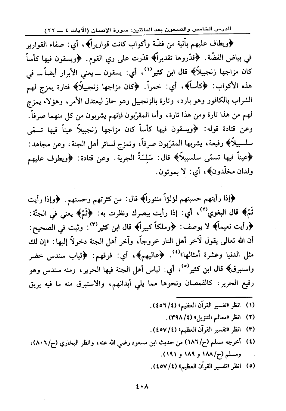 {وَيُطَافُ عَلَيْهِم بِآنِيَةٍ مِّن فِضَّةٍ وَأَكْوَابٍ كَانَتْ قَوَارِيرَا} ، أي: صفاء القوارير في بياض الفضة. {قَدَّرُوهَا تَقْدِيراً} قدرت على ري القوم. {وَيُسْقَوْنَ فِيهَا كَأْساً كَانَ مِزَاجُهَا زَنجَبِيلاً} ، قال ابن كثير، أي: يسقون - يعني: الأبرار أيضًا - في هذه الأكواب، {كَأْساً} ، أي: خمرًا. {كَانَ مِزَاجُهَا زَنجَبِيلاً} فتارة يمزج لهم الشراب بالكافور وهو بارد، وتارة بالزنجبيل وهو حار ليعتدل الأمر، وهؤلاء يمزج لهم من هذا تارة، ومن هذا تارة، وأما المقربون فإنهم يشربون من كل منهما صرفًا. وعن قتادة: قوله: {وَيُسْقَوْنَ فِيهَا كَأْساً كَانَ مِزَاجُهَا زَنجَبِيلاً * عَيْناً فِيهَا تُسَمَّى سَلْسَبِيلاً} رفيعة، يشربها المقربون صرفًا، وتمزج لسائر أهل الجنة، وعن مجاهد: {عَيْناً فِيهَا تُسَمَّى سَلْسَبِيلاً} قال: سلسة الجرية. وعن قتادة: {وَيَطُوفُ عَلَيْهِمْ وِلْدَانٌ مُّخَلَّدُونَ} أي: لا يموتون.