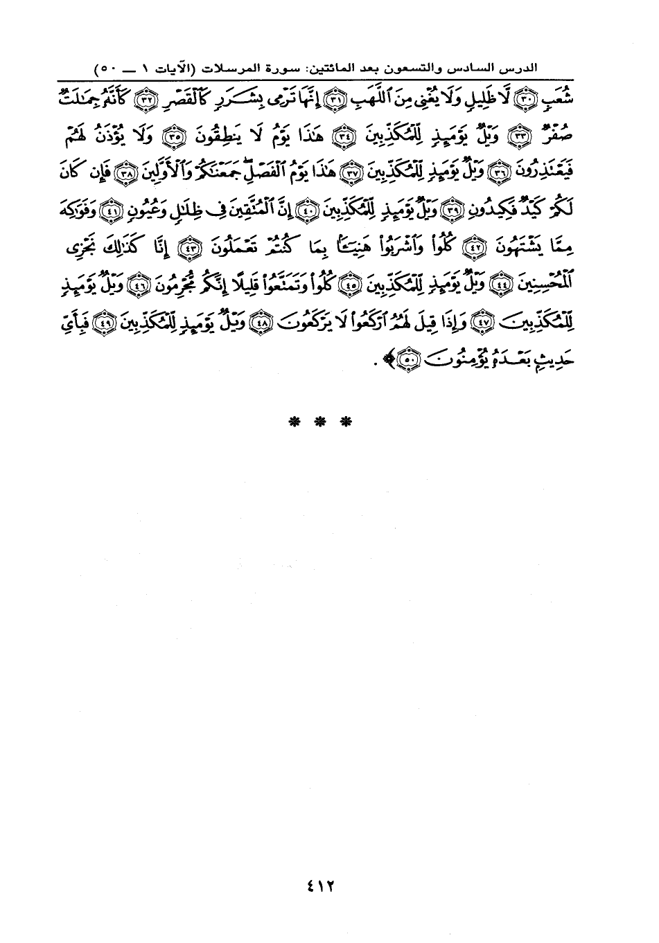 هَذَا يَوْمُ لَا يَنطِقُونَ (35) وَلَا يُؤْذَنُ لَهُمْ فَيَعْتَذِرُونَ (36) وَيْلٌ يَوْمَئِذٍ لِّلْمُكَذِّبِينَ (37) هَذَا يَوْمُ الْفَصْلِ جَمَعْنَاكُمْ وَالْأَوَّلِينَ (38) فَإِن كَانَ لَكُمْ كَيْدٌ فَكِيدُونِ (39) وَيْلٌ يَوْمَئِذٍ لِّلْمُكَذِّبِينَ (40) إِنَّ الْمُتَّقِينَ فِي ظِلَالٍ وَعُيُونٍ (41) وَفَوَاكِهَ مِمَّا يَشْتَهُونَ (42) كُلُوا وَاشْرَبُوا هَنِيئاً بِمَا كُنتُمْ تَعْمَلُونَ (43) إِنَّا كَذَلِكَ نَجْزِي الْمُحْسِنينَ (44) وَيْلٌ يَوْمَئِذٍ لِّلْمُكَذِّبِينَ (45) كُلُوا وَتَمَتَّعُوا قَلِيلاً إِنَّكُم مُّجْرِمُونَ (46) وَيْلٌ يَوْمَئِذٍ لِّلْمُكَذِّبِينَ (47) وَإِذَا قِيلَ لَهُمُ ارْكَعُوا لَا يَرْكَعُونَ (48) وَيْلٌ يَوْمَئِذٍ لِّلْمُكَذِّبِينَ (49) فَبِأَيِّ حَدِيثٍ بَعْدَهُ يُؤْمِنُونَ (50) } .