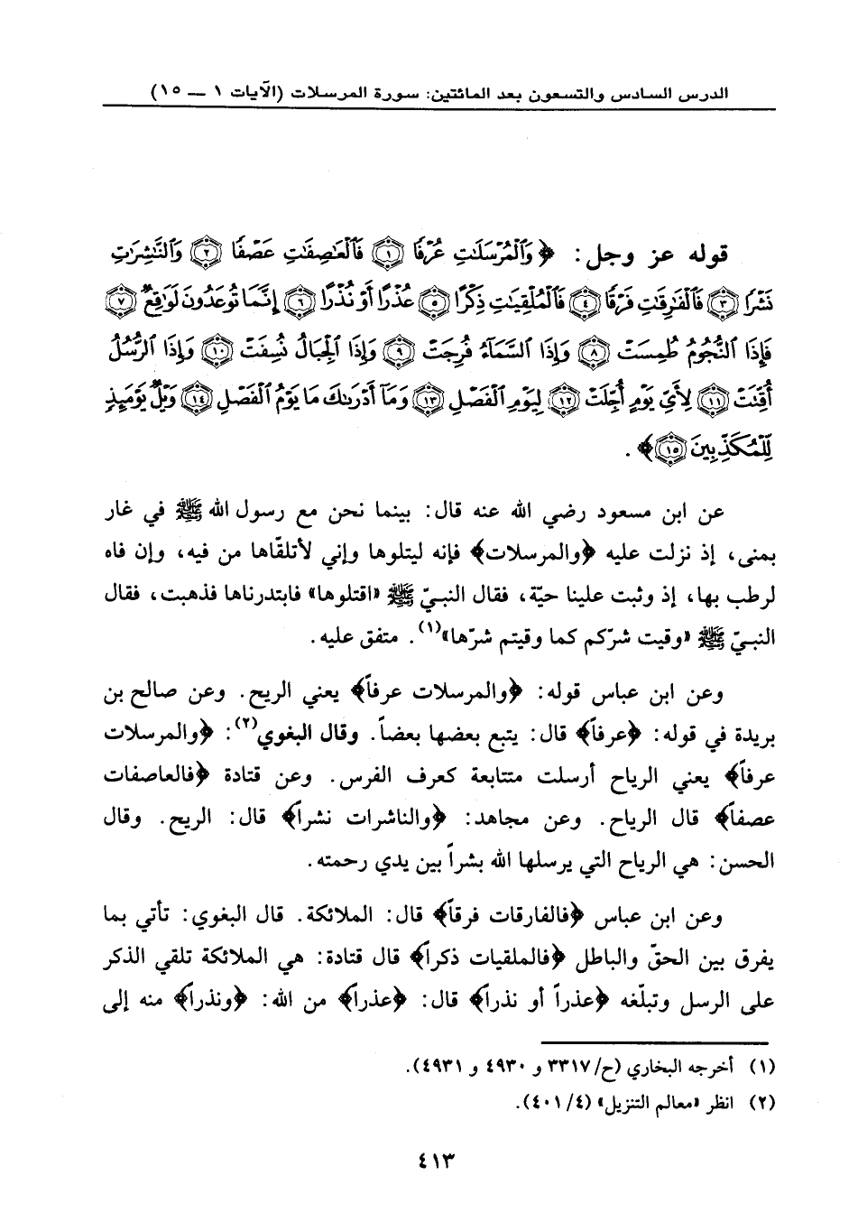 قوله عز وجل: {وَالْمُرْسَلَاتِ عُرْفاً (1) فَالْعَاصِفَاتِ عَصْفاً (2) وَالنَّاشِرَاتِ نَشْراً (3) فَالْفَارِقَاتِ فَرْقاً (4) فَالْمُلْقِيَاتِ ذِكْراً (5) عُذْراً أَوْ نُذْراً (6) إِنَّمَا تُوعَدُونَ لَوَاقِعٌ (7) فَإِذَا النُّجُومُ طُمِسَتْ (8) وَإِذَا السَّمَاء فُرِجَتْ (9) وَإِذَا الْجِبَالُ نُسِفَتْ (10) وَإِذَا الرُّسُلُ أُقِّتَتْ (11) لِأَيِّ يَوْمٍ أُجِّلَتْ (12) لِيَوْمِ الْفَصْلِ (13) وَمَا أَدْرَاكَ مَا يَوْمُ الْفَصْلِ (14) وَيْلٌ يَوْمَئِذٍ لِّلْمُكَذِّبِينَ (15) } .