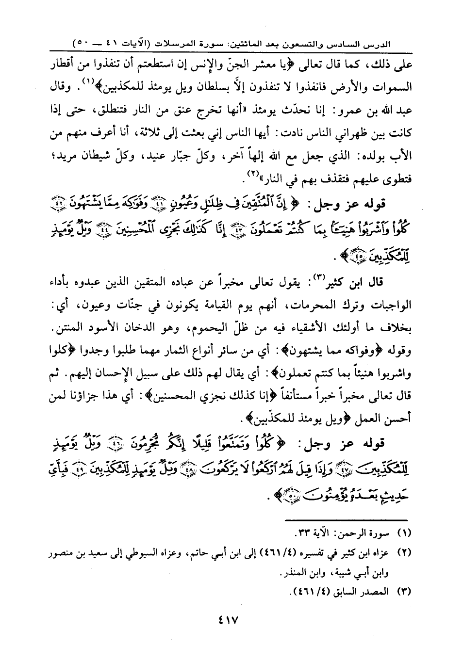 قوله عز وجل: {إِنَّ الْمُتَّقِينَ فِي ظِلَالٍ وَعُيُونٍ (41) وَفَوَاكِهَ مِمَّا يَشْتَهُونَ (42) كُلُوا وَاشْرَبُوا هَنِيئاً بِمَا كُنتُمْ تَعْمَلُونَ (43) إِنَّا كَذَلِكَ نَجْزِي الْمُحْسِنينَ (44) وَيْلٌ يَوْمَئِذٍ لِّلْمُكَذِّبِينَ (45) } .