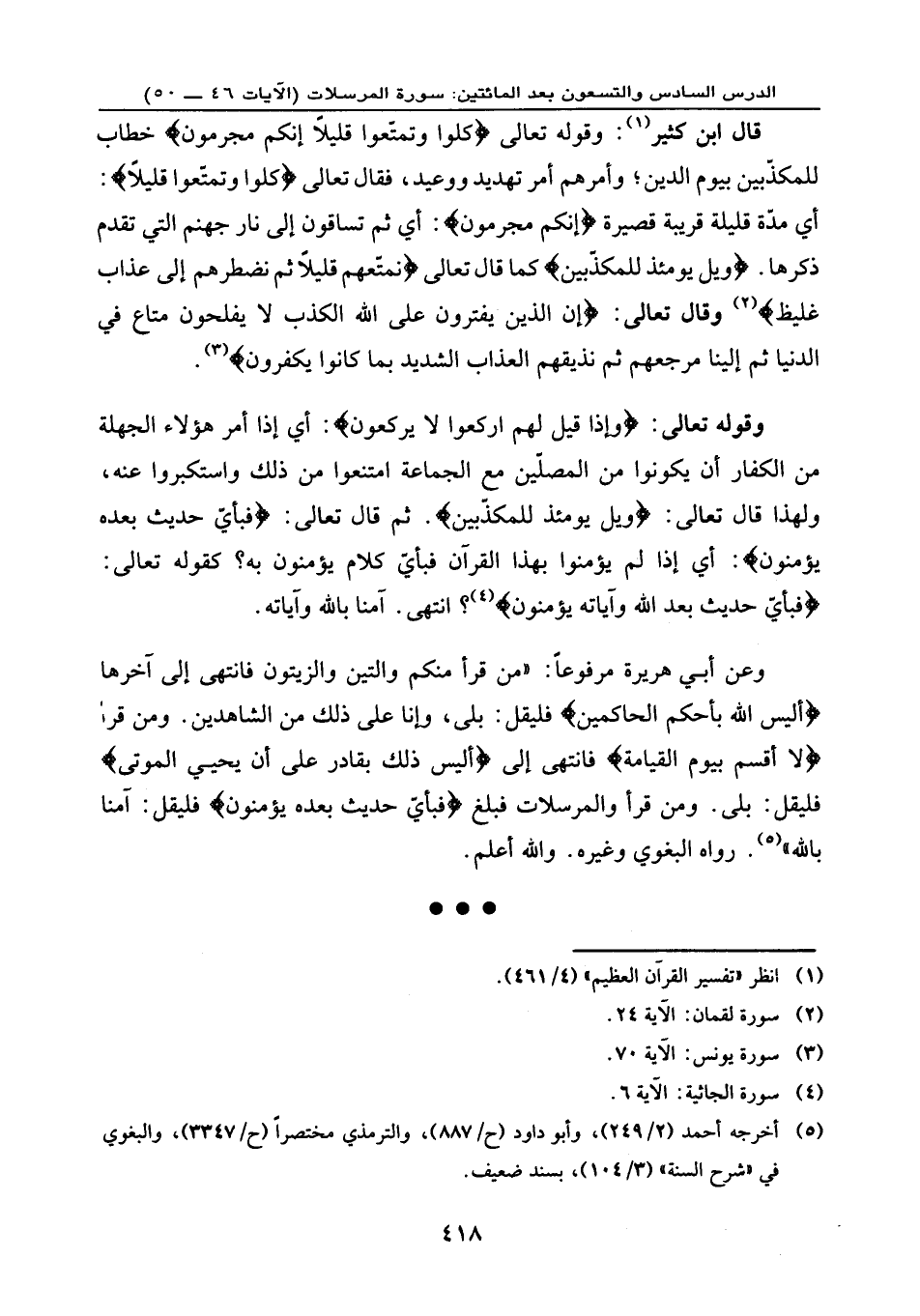 قال ابن كثير: وقوله تعالى: {كُلُوا وَتَمَتَّعُوا قَلِيلاً إِنَّكُم مُّجْرِمُونَ} خطاب للمكذبين بيوم الدين؛ وأمرهم أمر تهديد ووعيد، فقال تعالى: {كُلُوا وَتَمَتَّعُوا قَلِيلاً} أي: مدة قليلة قريبة قصيرة {إِنَّكُم مُّجْرِمُونَ} أي: ثم تساقون إلى نار جهنم التي تقدم ذكرها. {وَيْلٌ يَوْمَئِذٍ لِّلْمُكَذِّبِينَ} ، كما قال تعالى: نُمَتِّعُهُمْ قَلِيلاً ثُمَّ نَضْطَرُّهُمْ إِلَى عَذَابٍ غَلِيظٍ} وقال تعالى: {إِنَّ الَّذِينَ يَفْتَرُونَ عَلَى اللهِ الْكَذِبَ لاَ يُفْلِحُونَ * مَتَاعٌ فِي الدُّنْيَا ثُمَّ إِلَيْنَا مَرْجِعُهُمْ ثُمَّ نُذِيقُهُمُ الْعَذَابَ الشَّدِيدَ بِمَا كَانُواْ يَكْفُرُونَ} .