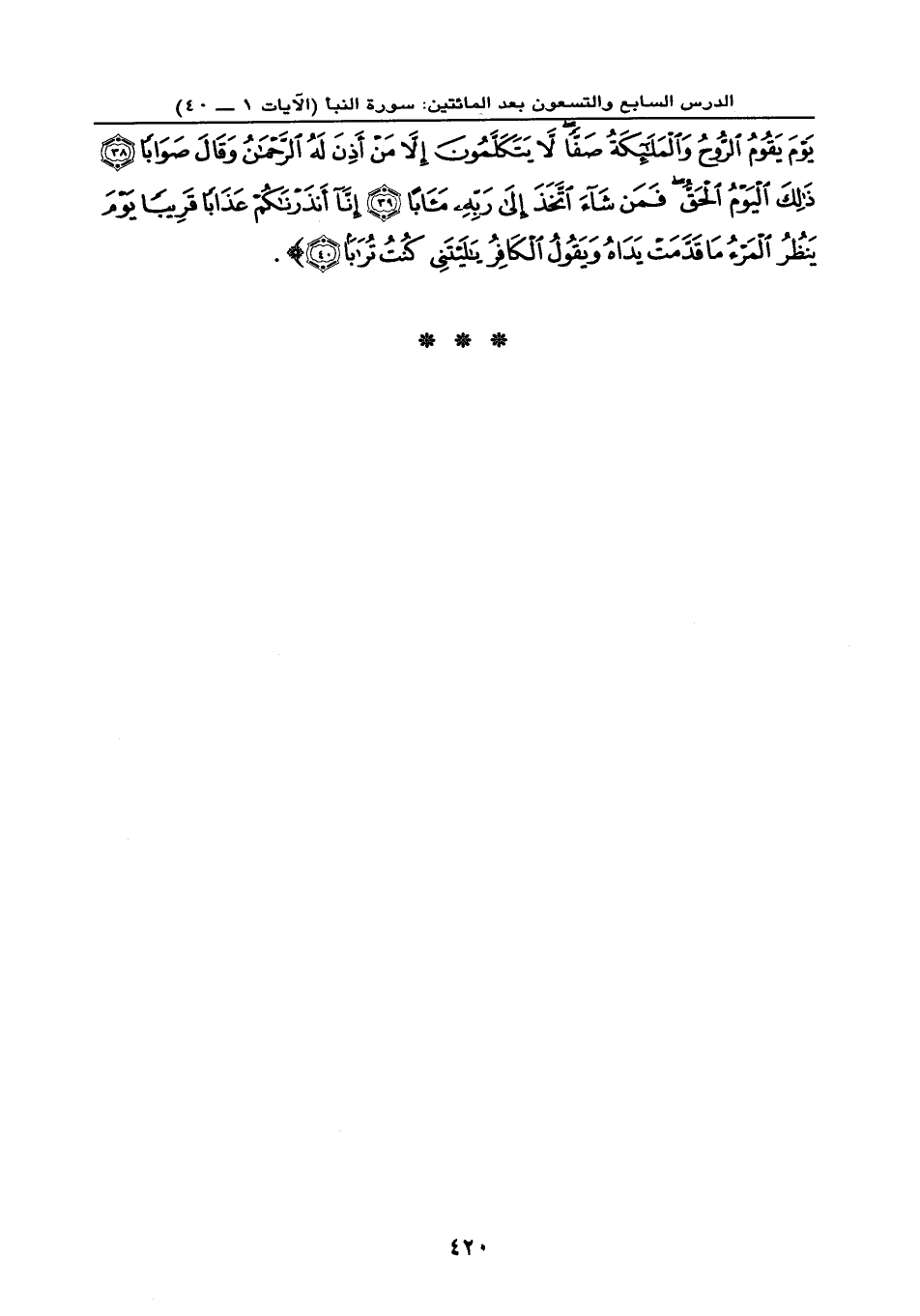 يَوْمَ يَقُومُ الرُّوحُ وَالْمَلَائِكَةُ صَفّاً لَّا يَتَكَلَّمُونَ إِلَّا مَنْ أَذِنَ لَهُ الرحْمَنُ وَقَالَ صَوَاباً (38) ذَلِكَ الْيَوْمُ الْحَقُّ فَمَن شَاء اتَّخَذَ إِلَى رَبِّهِ مَآباً (39) إِنَّا أَنذَرْنَاكُمْ عَذَاباً قَرِيباً يَوْمَ يَنظُرُ الْمَرْءُ مَا قَدَّمَتْ يَدَاهُ وَيَقُولُ الْكَافِرُ يَا لَيْتَنِي كُنتُ تُرَاباً (40) } .